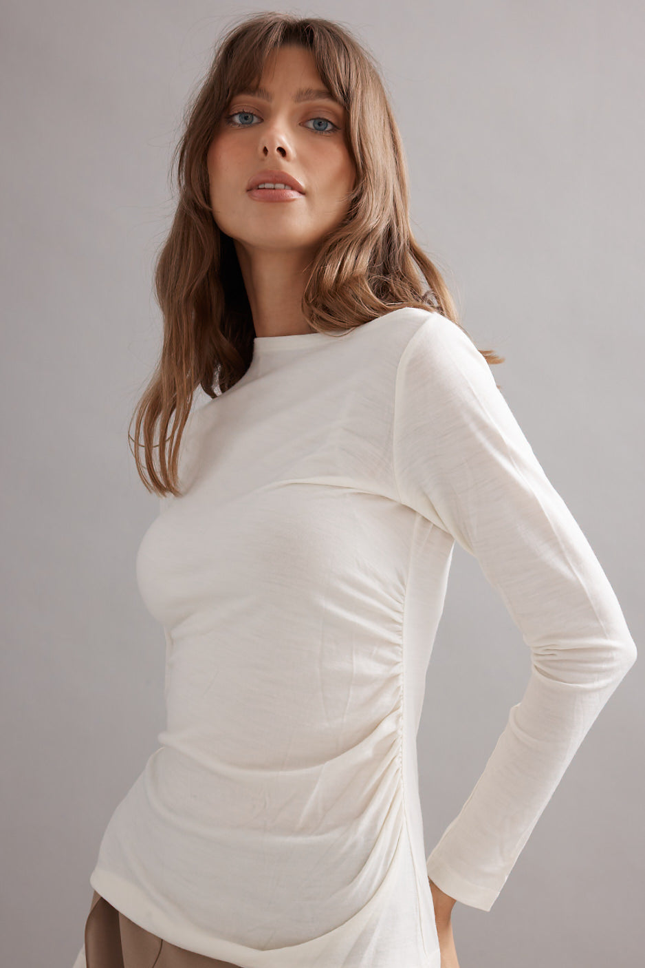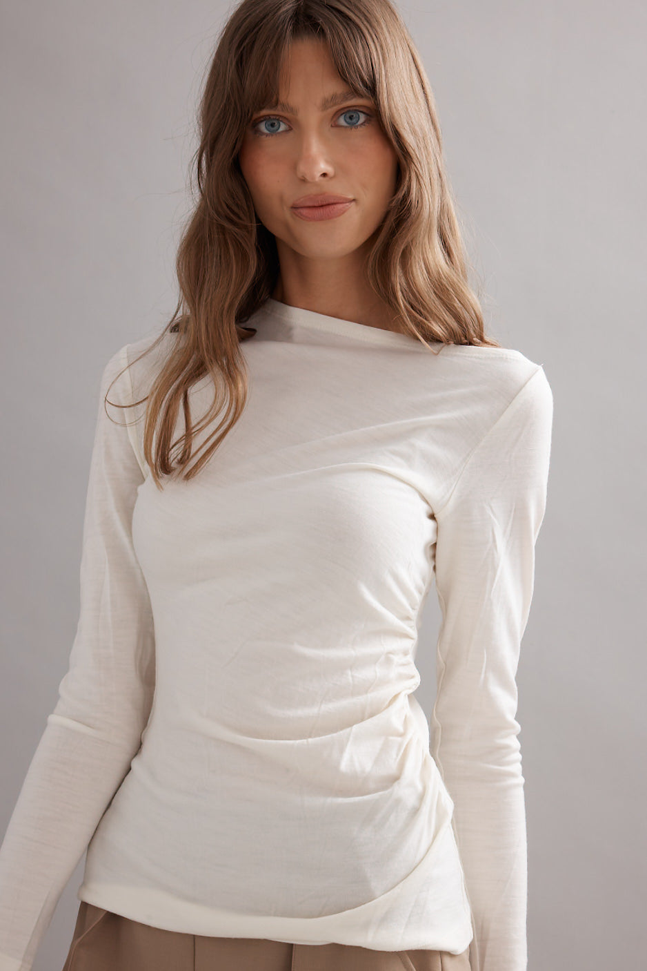 More than just your extra wool layer. This piece speaks for itself. An essential merino knit to be worn over and over again. Featuring a high asymmetric neckline, subtle side ruching detail and crafted from NZ Merino to feel beautiful on the skin.