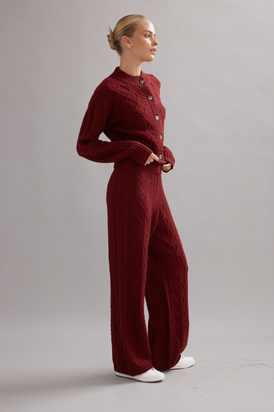 Designed for ultimate comfort and elevated lounging, our Cable Knit Pant blends relaxed elegance with refined texture. Crafted from a luxurious cashmere blend, these wide-leg pants feature an all-over cable knit, elasticated foldable waistband, and a draped silhouette that moves with you. Style them with the coordinating cardi or a crisp shirt for the perfect off-duty look.