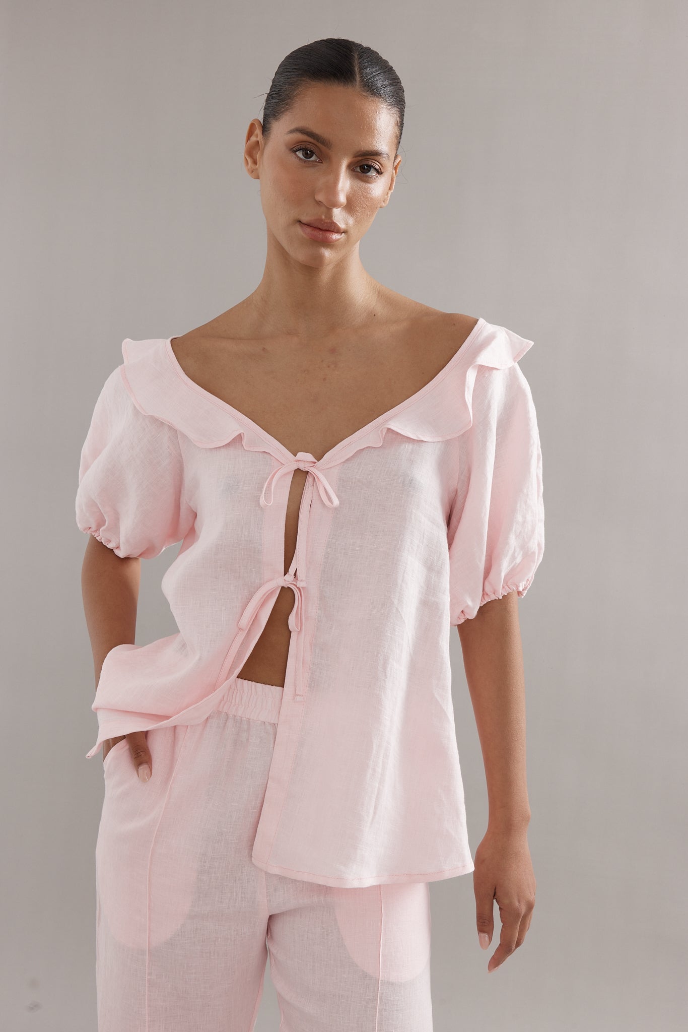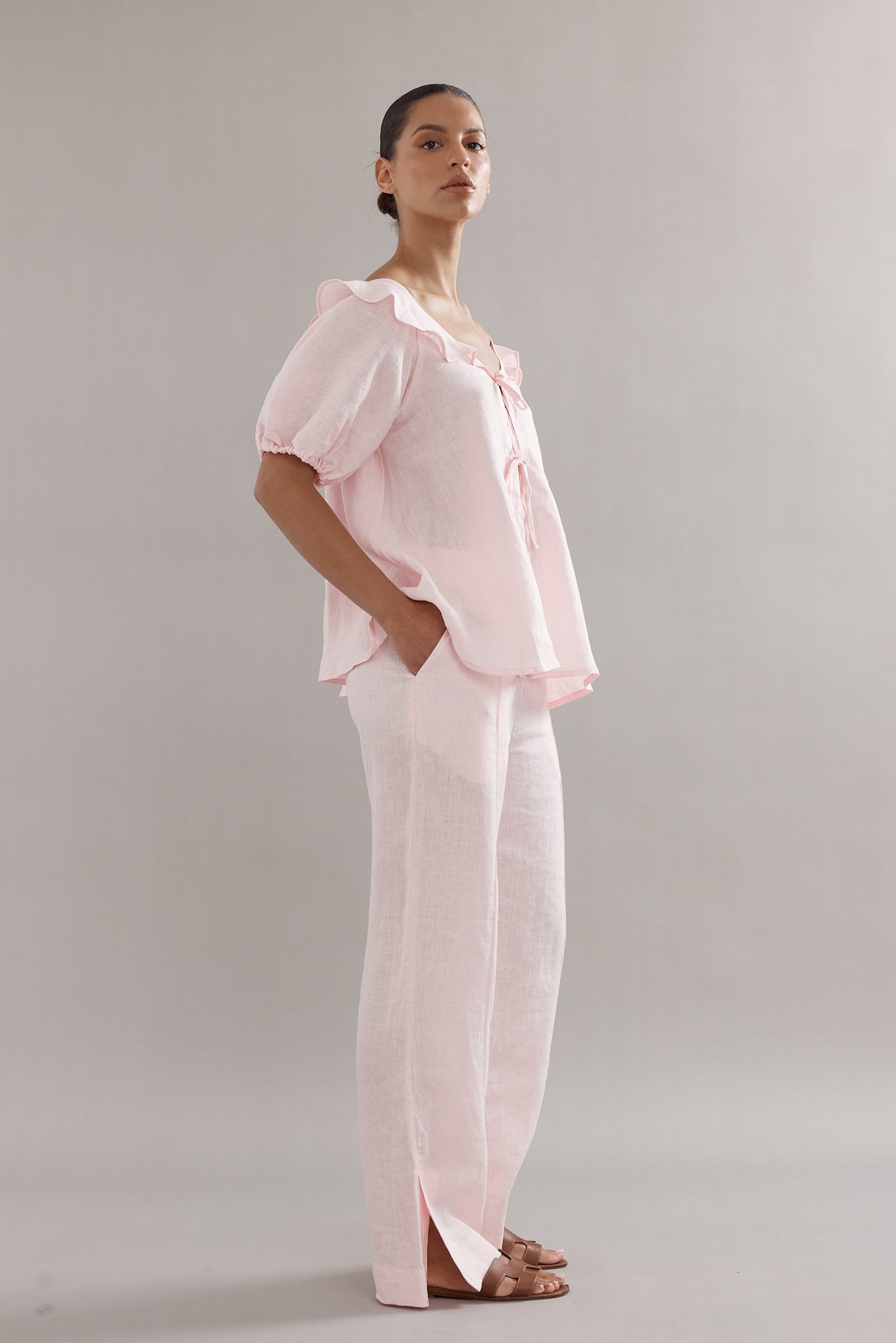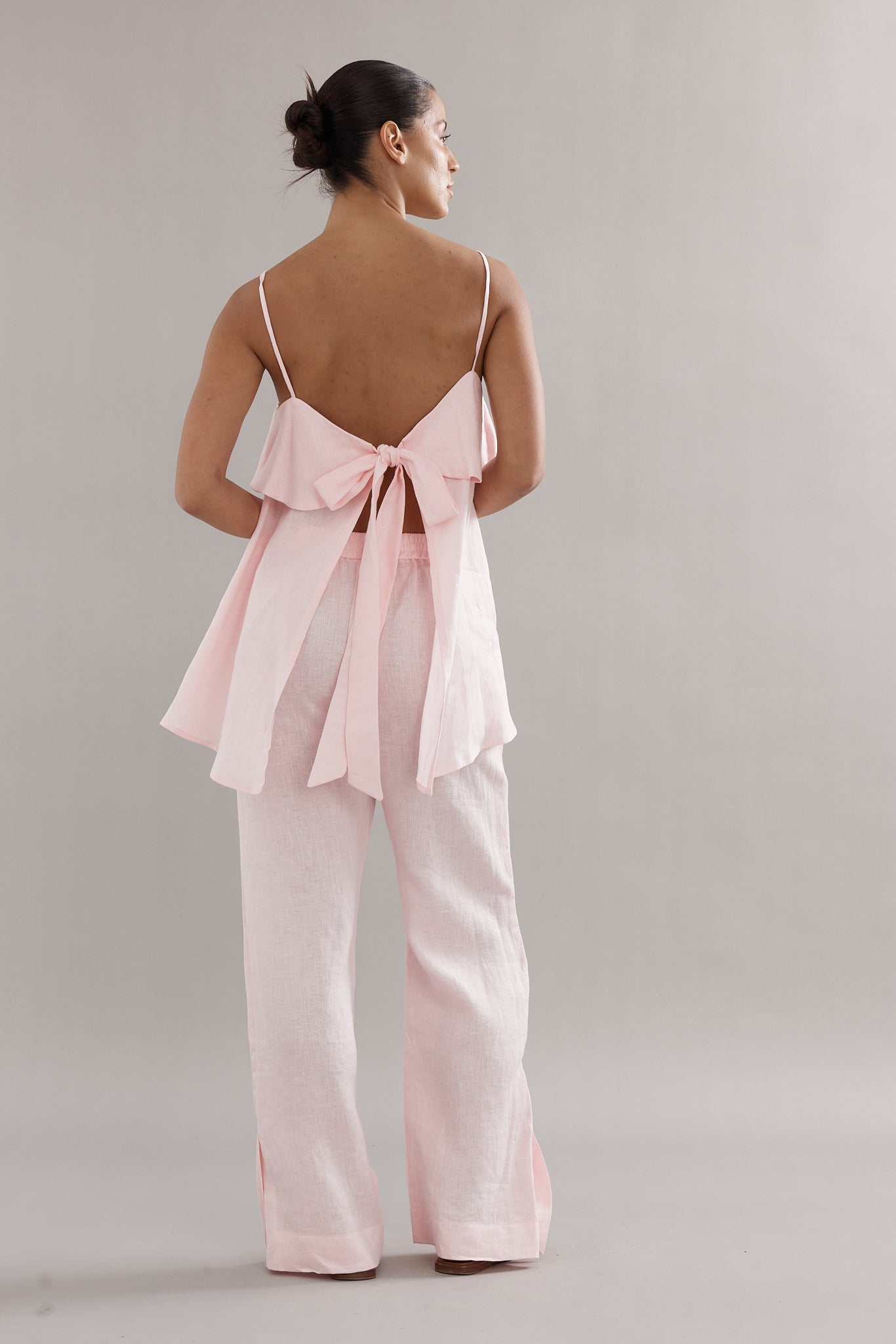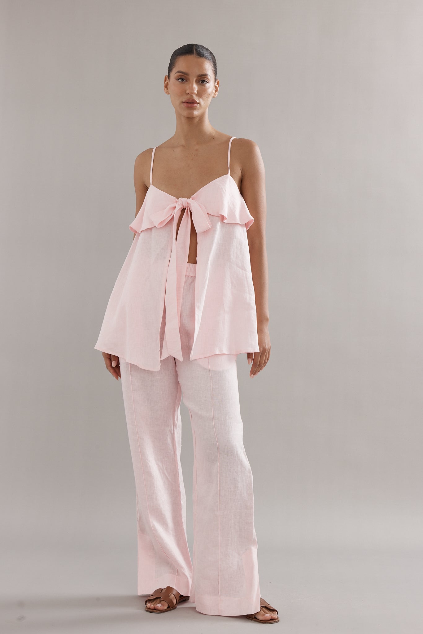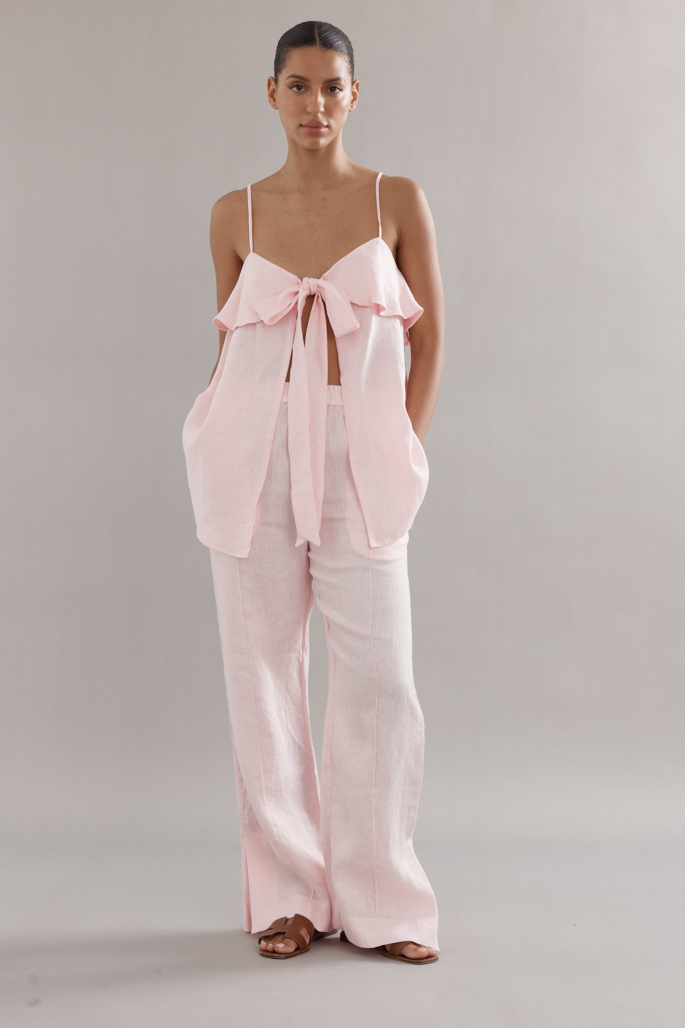 The pant you'll find yourself wearing on repeat. Featuring an elasticated waist, split detailing and side pockets. Pair with one of its matching soft Pink Linen companions for a summer staple look.