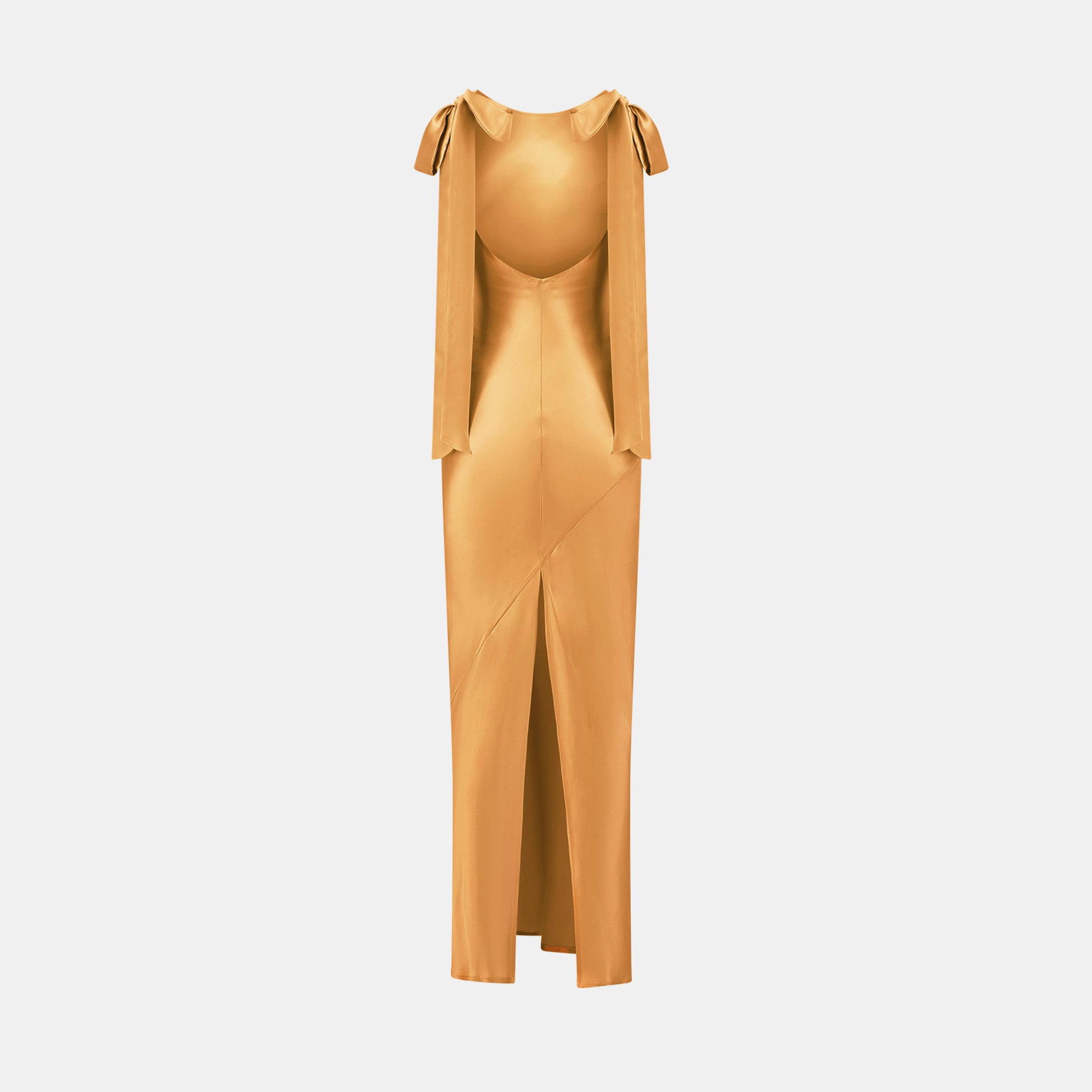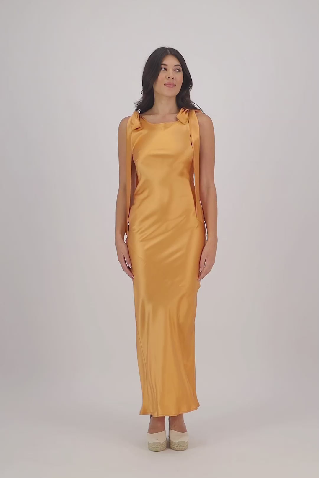 The Wilmer dress is fully cut on the bias to flatter your body, and features a low back, a high back-split, and adjustable shoulder ties.