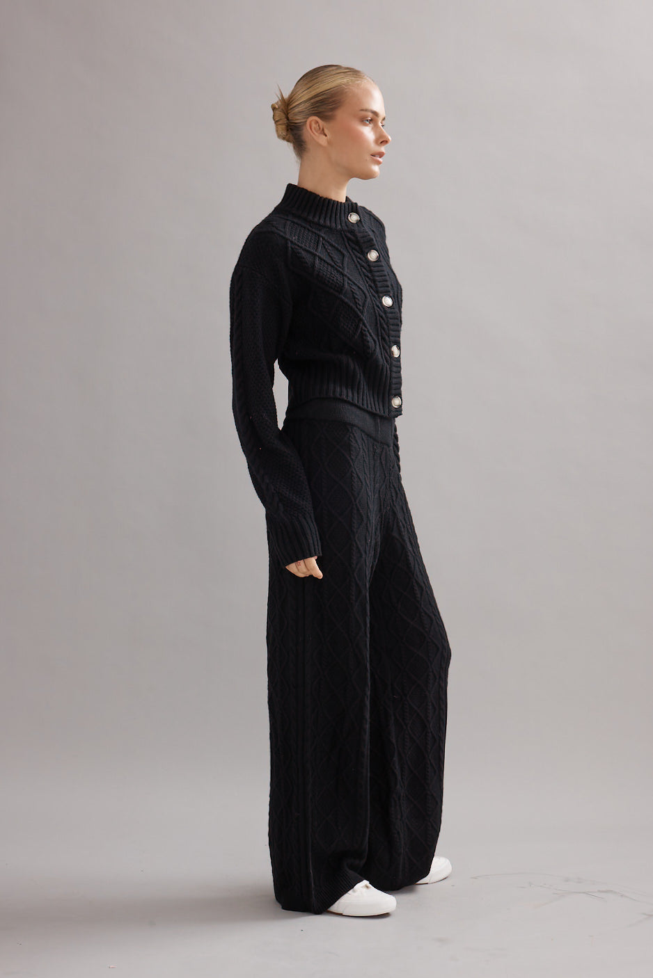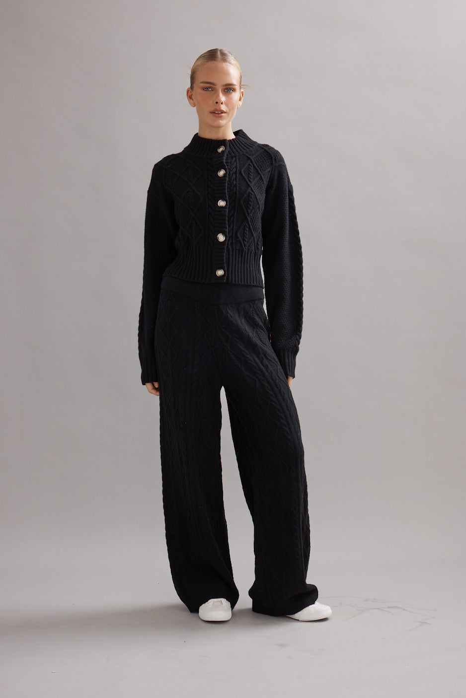 A timeless essential reimagined in ultra-soft cashmere, our Cable Knit Cardi is the perfect layering piece for the colder months. Featuring a chunky cable pattern, sculpted rib trims, and statement buttons, it offers a chic, flattering silhouette while keeping you warm. Wear it with the matching pants or your favourite pair of denim.