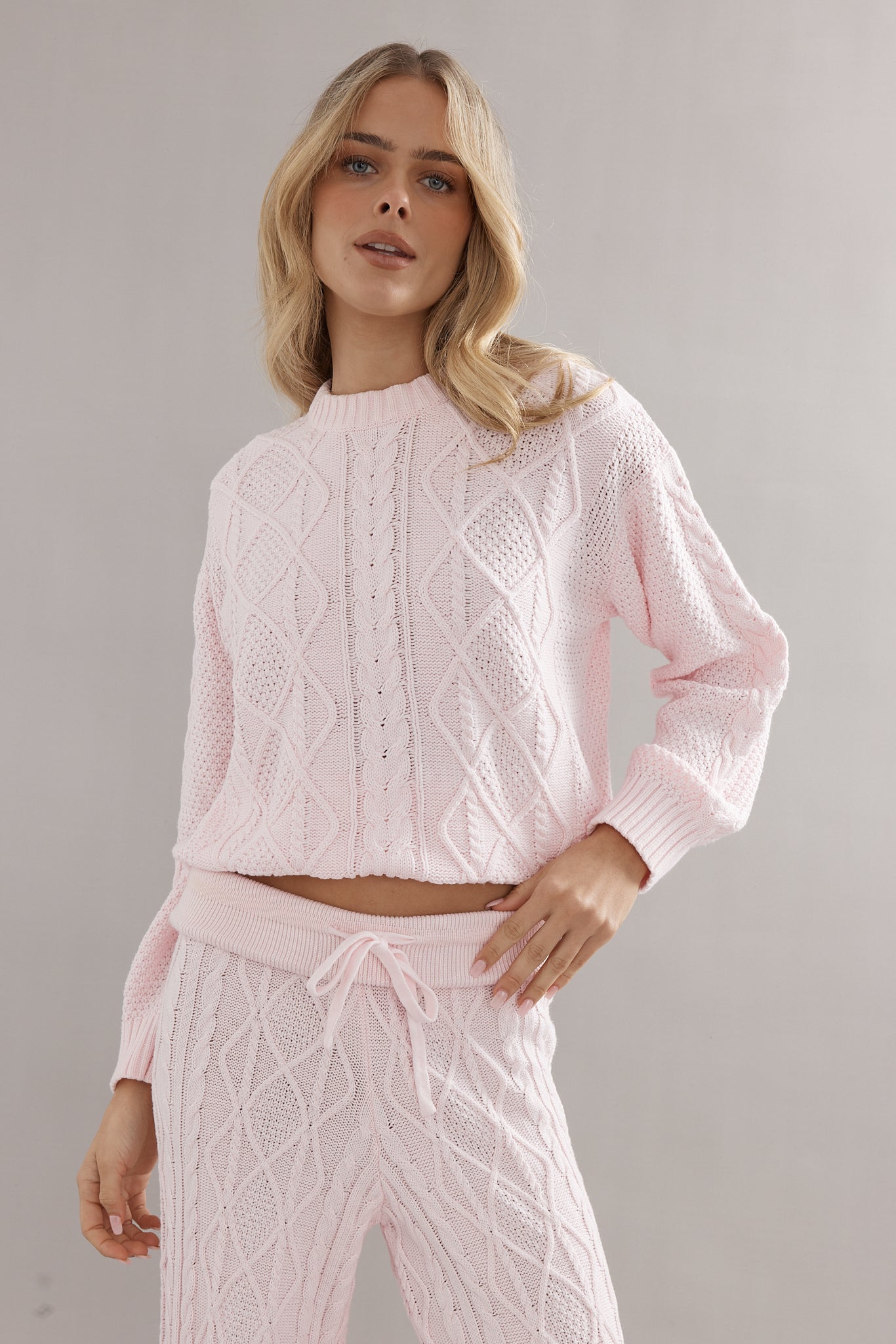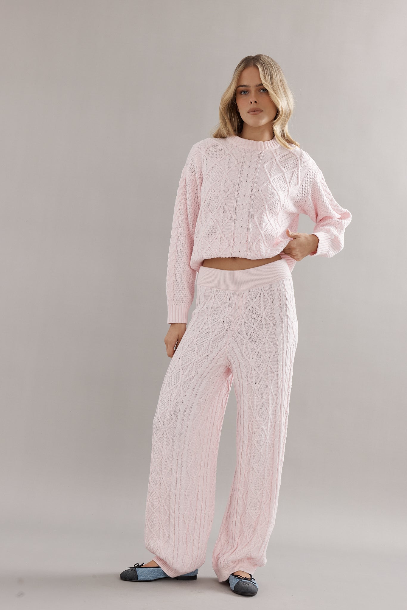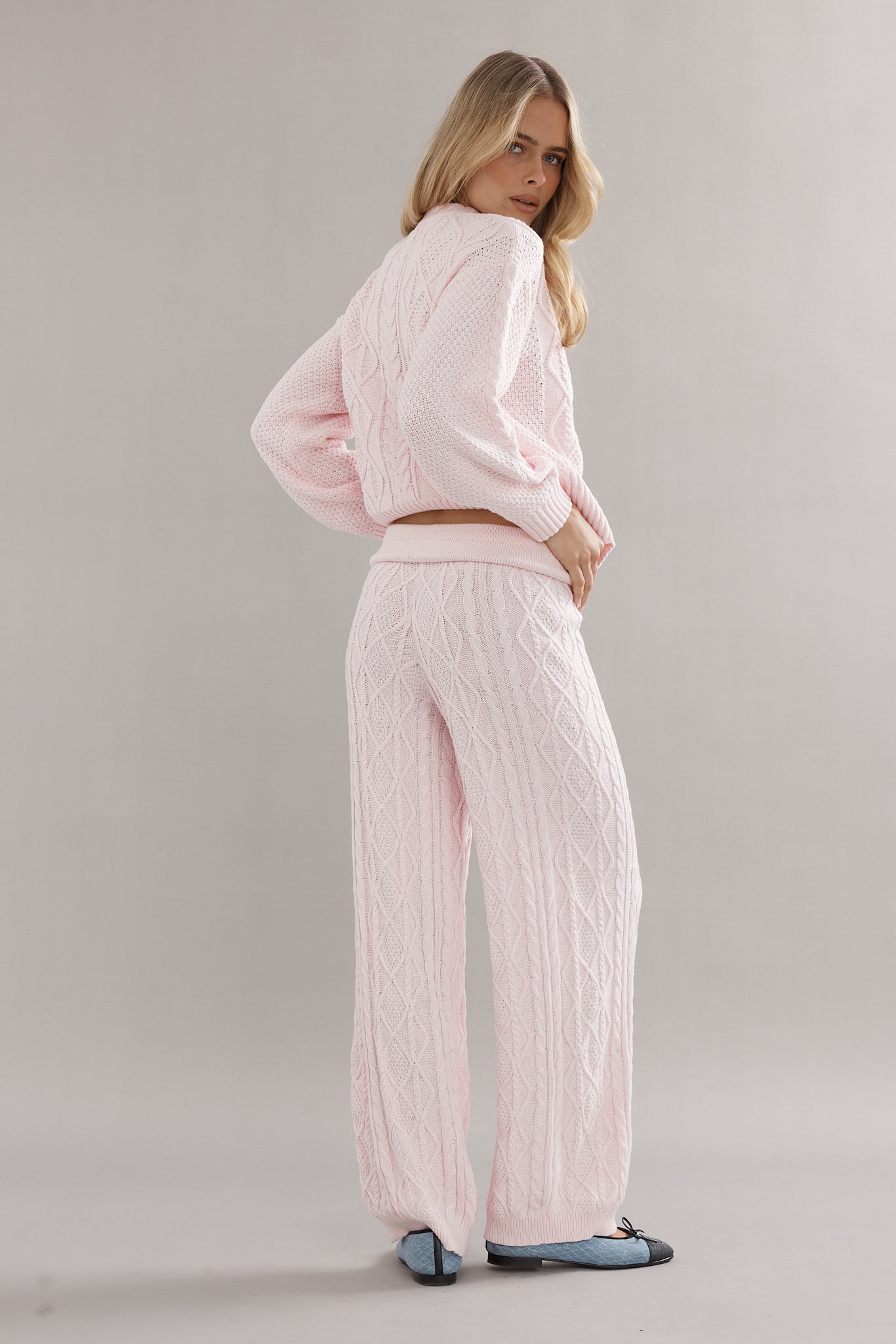 Designed for ultimate comfort and elevated lounging, our Cable Knit Pant blends relaxed elegance with refined texture. Crafted from a luxurious cashmere blend, these wide-leg pants feature an all-over cable knit, elasticated foldable waistband, and a draped silhouette that moves with you. Style them with the coordinating Pink jumper or a crisp shirt for the perfect off-duty look.