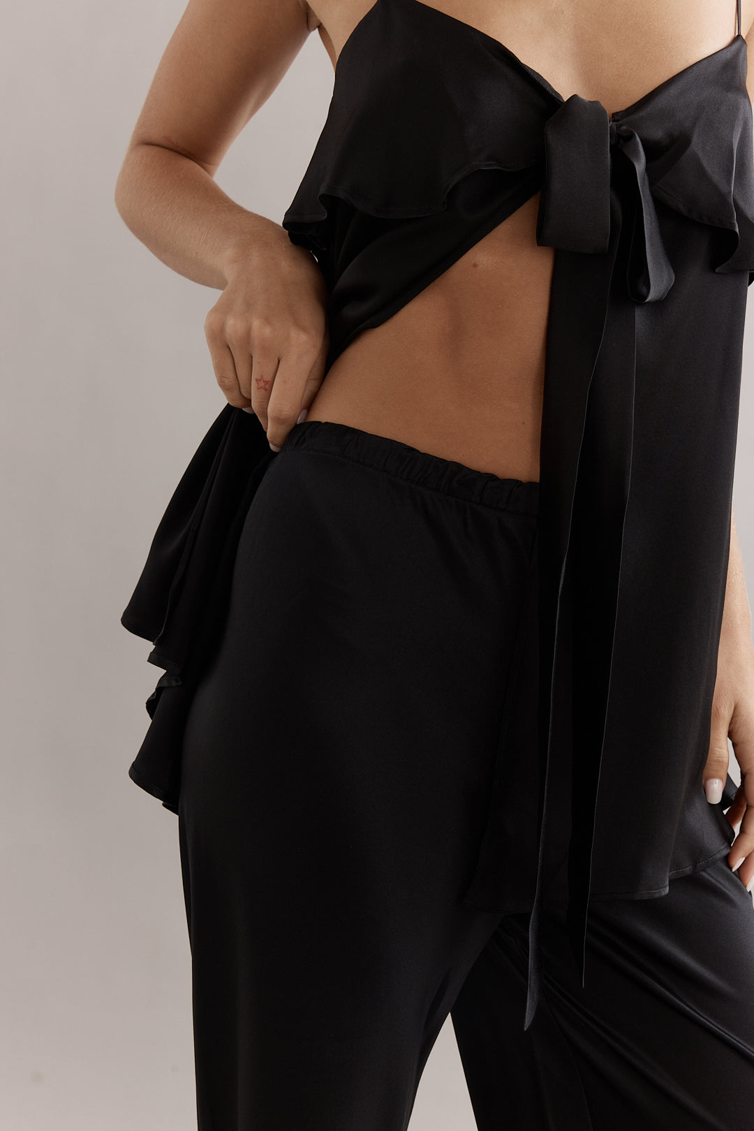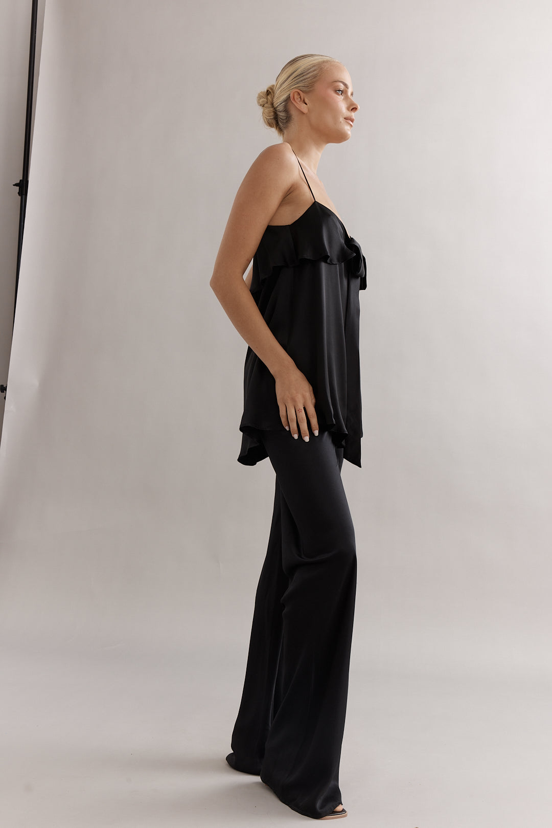 The Chelsea Pant is cut on the bias from fluid black silk, designed to skim the body beautifully. Finished with an elasticated waistband for all-day comfort, it’s the perfect balance of polish and ease. Pair with the Rio, Maeve or Blair top for a refined, coordinated look — or style simply with a classic knit or tee for understated elegance.