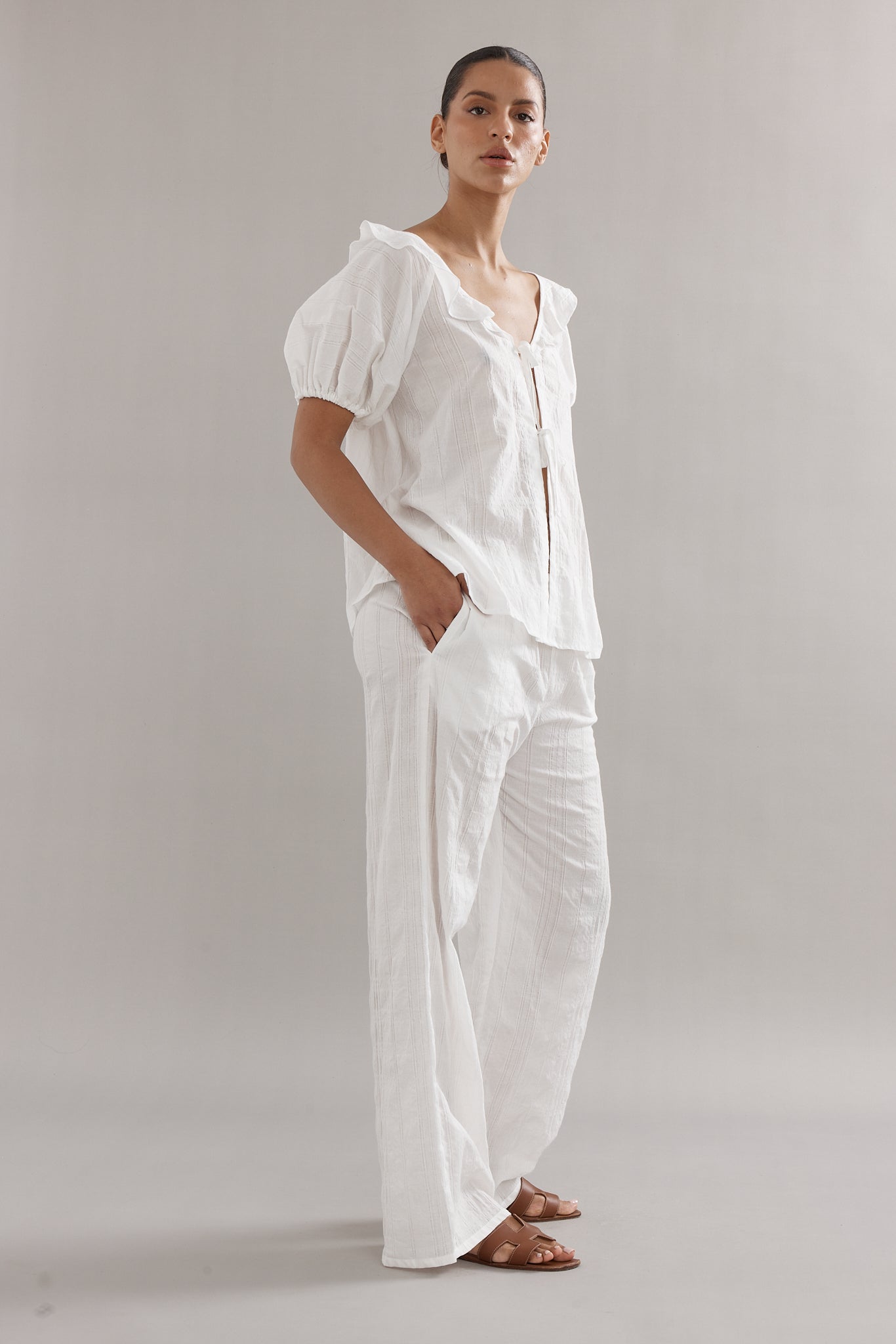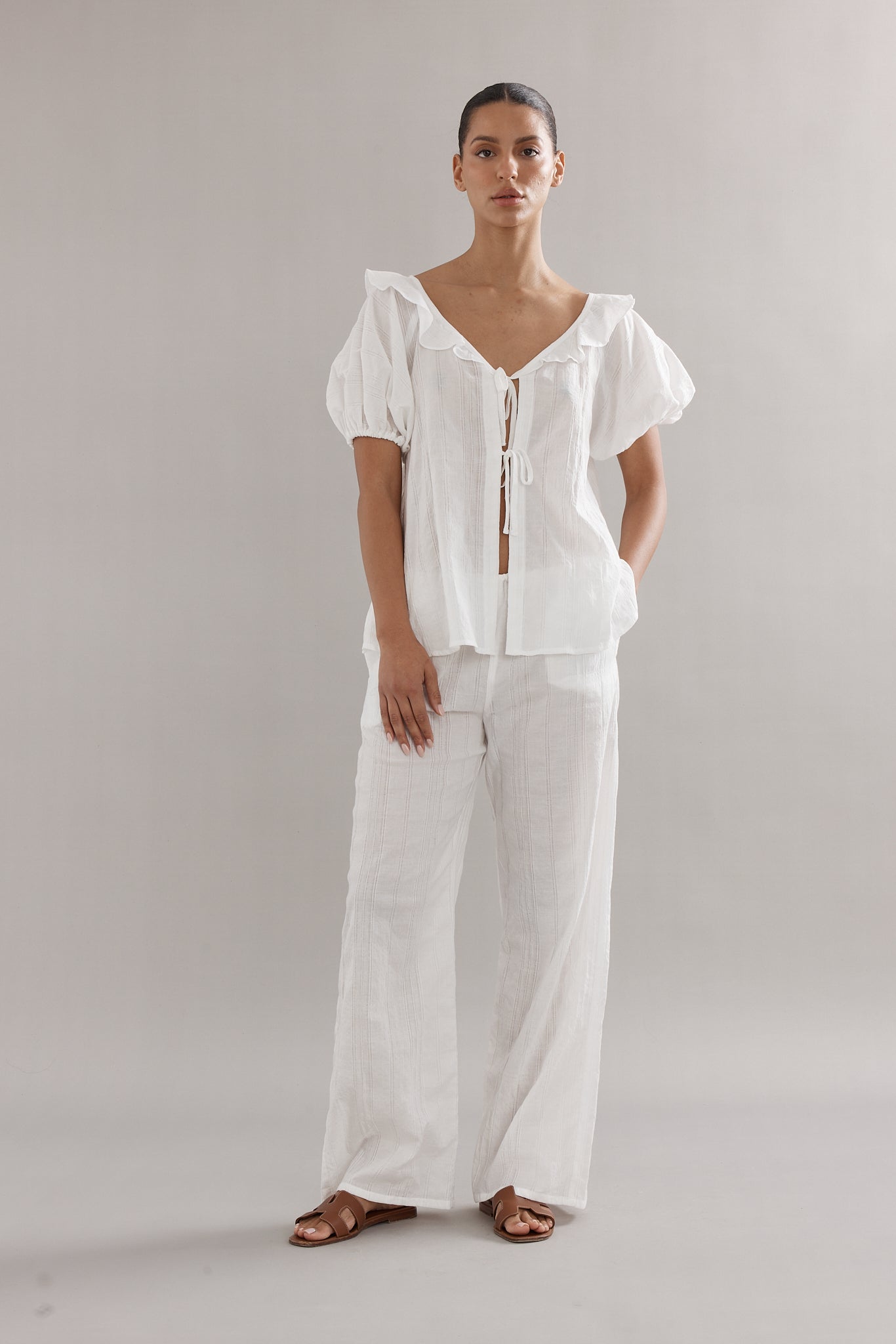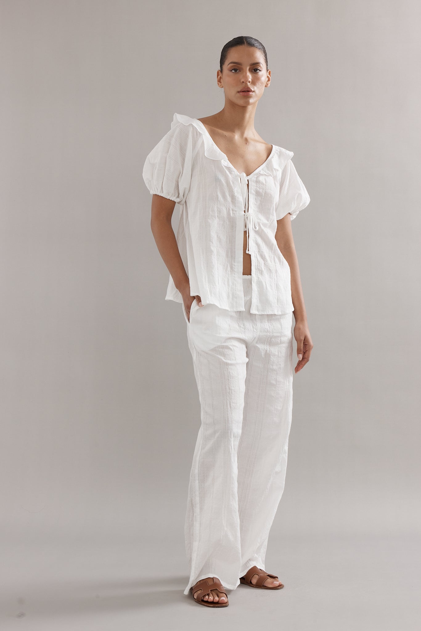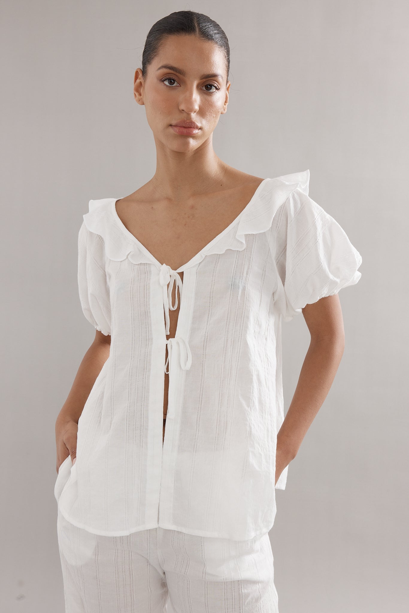 Our delicate little darling blouse in an all new white stripe colour way. Your summer go-to to throw on and go. Pair with the matching Low Tide Pants for the ultimate summer combo.