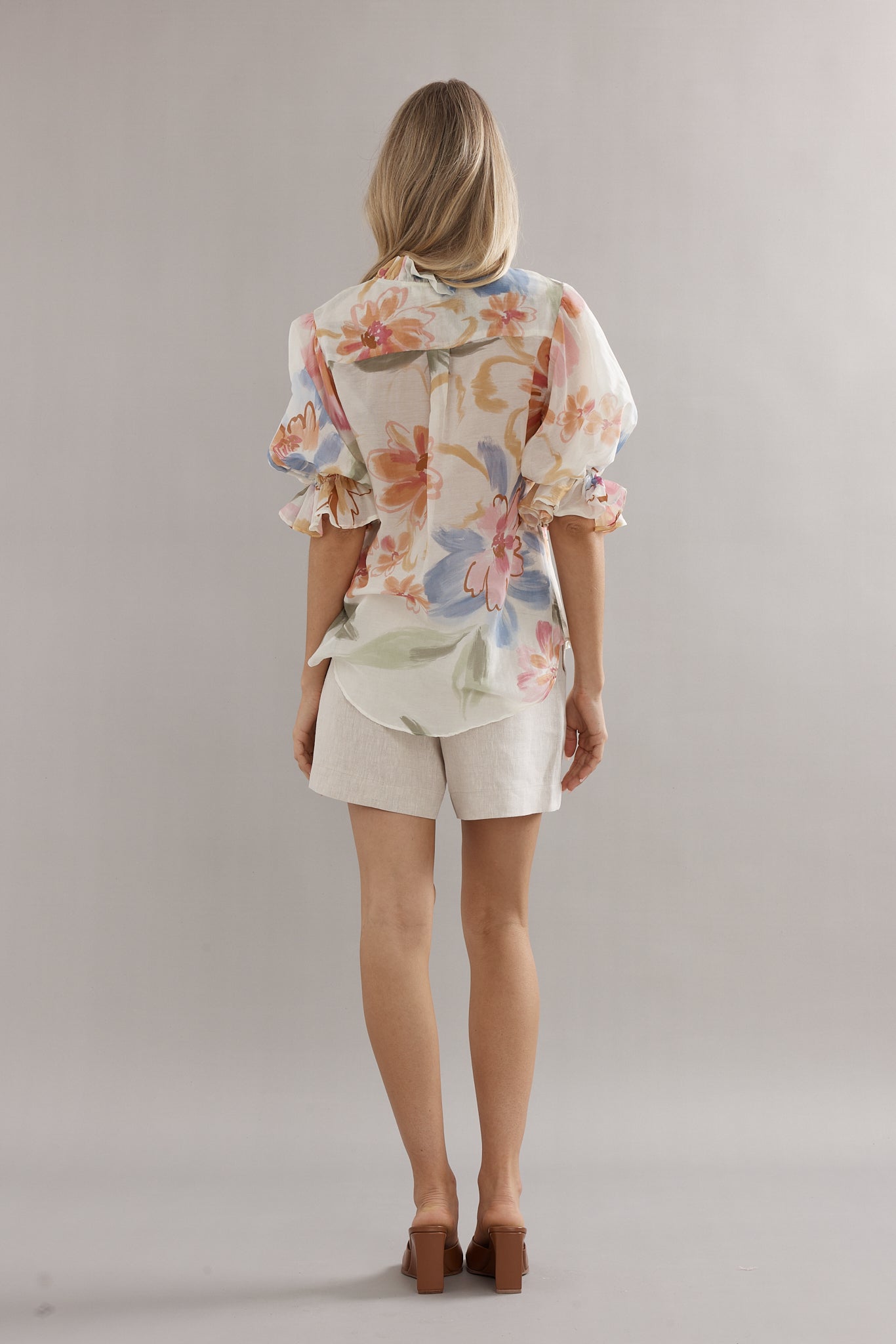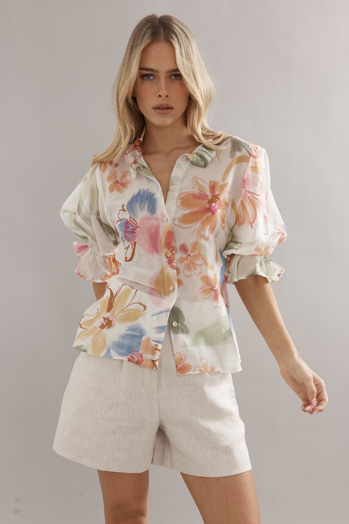 Softly structured and refined, the Soho Blouse features a ruffled neckline and puff sleeves finished with delicate frill cuffs. Crafted from lightweight fabric with an easy, relaxed fit, it pairs well with both casual and polished looks.