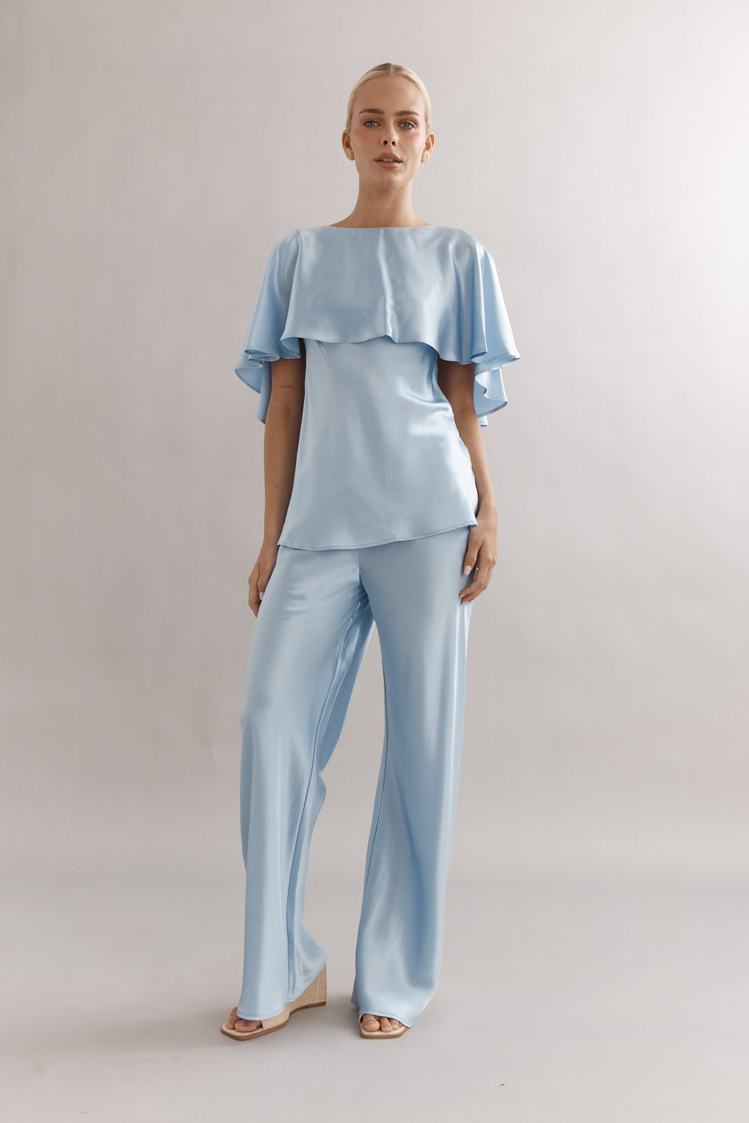 The Blair Top — feminine and chic. In our signature silk, this short sleeve style features a soft frill cape detail for beautiful movement. Style with the matching silk Chelsea Pant for a statement set, or wear with denim for an elevated everyday look.
