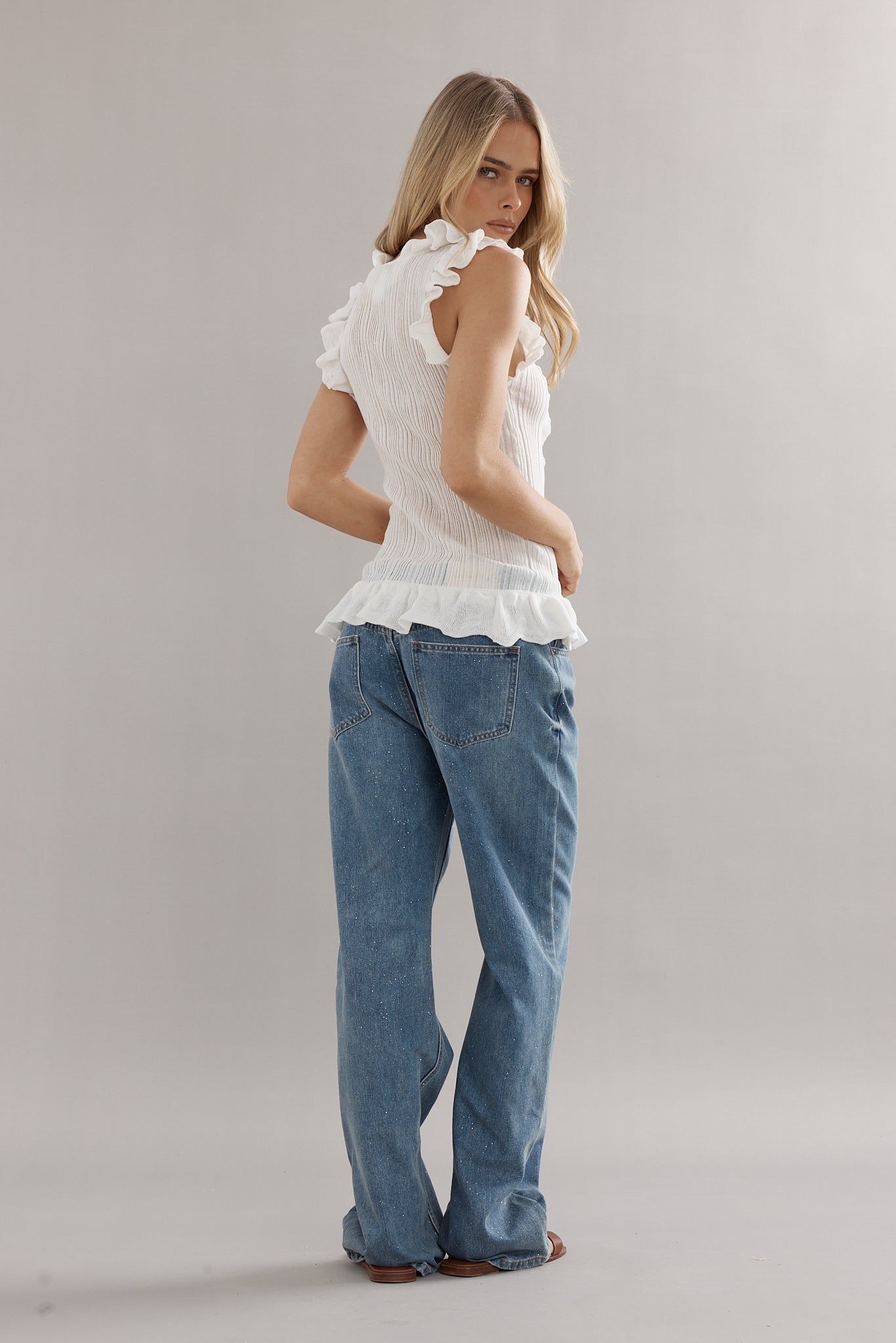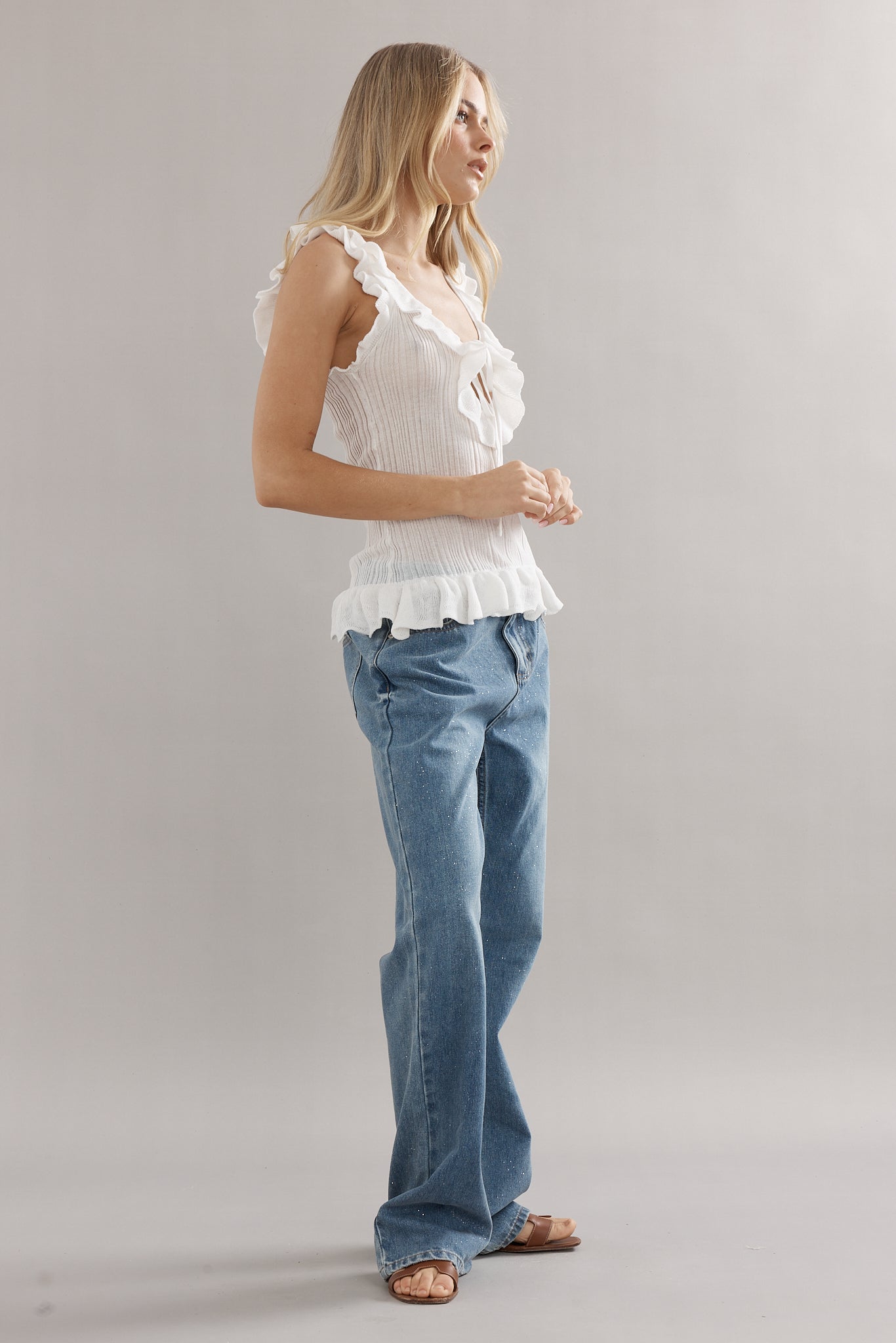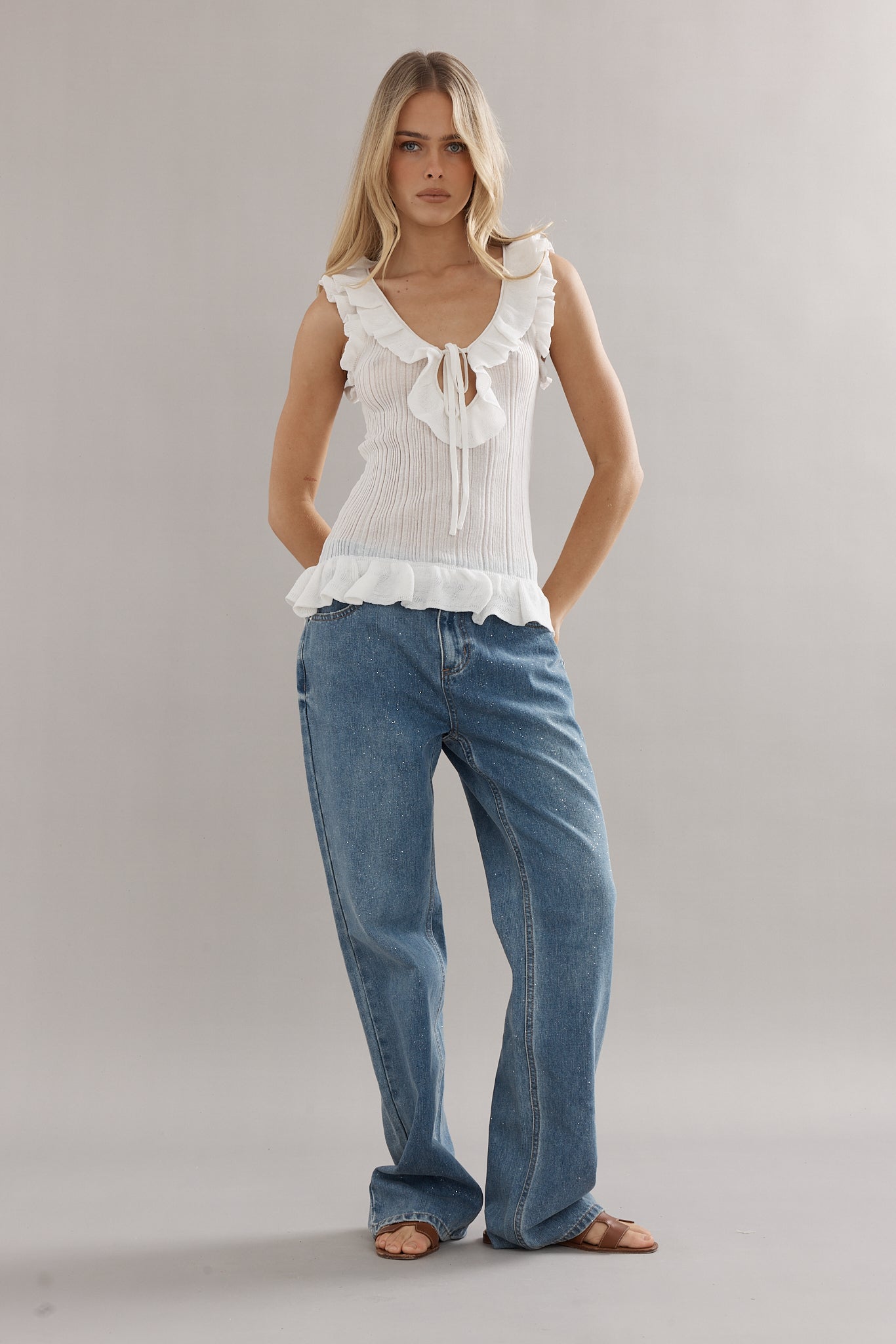 A knit tank, with a feminine twist. Designed in the same rib knit as The Angelica Dress, The Darwin Tank is finished with ruffled edges and a tie-front neckline. Available in blue, white, and black, she’s the versatile little number you’ll be reaching for again and again.