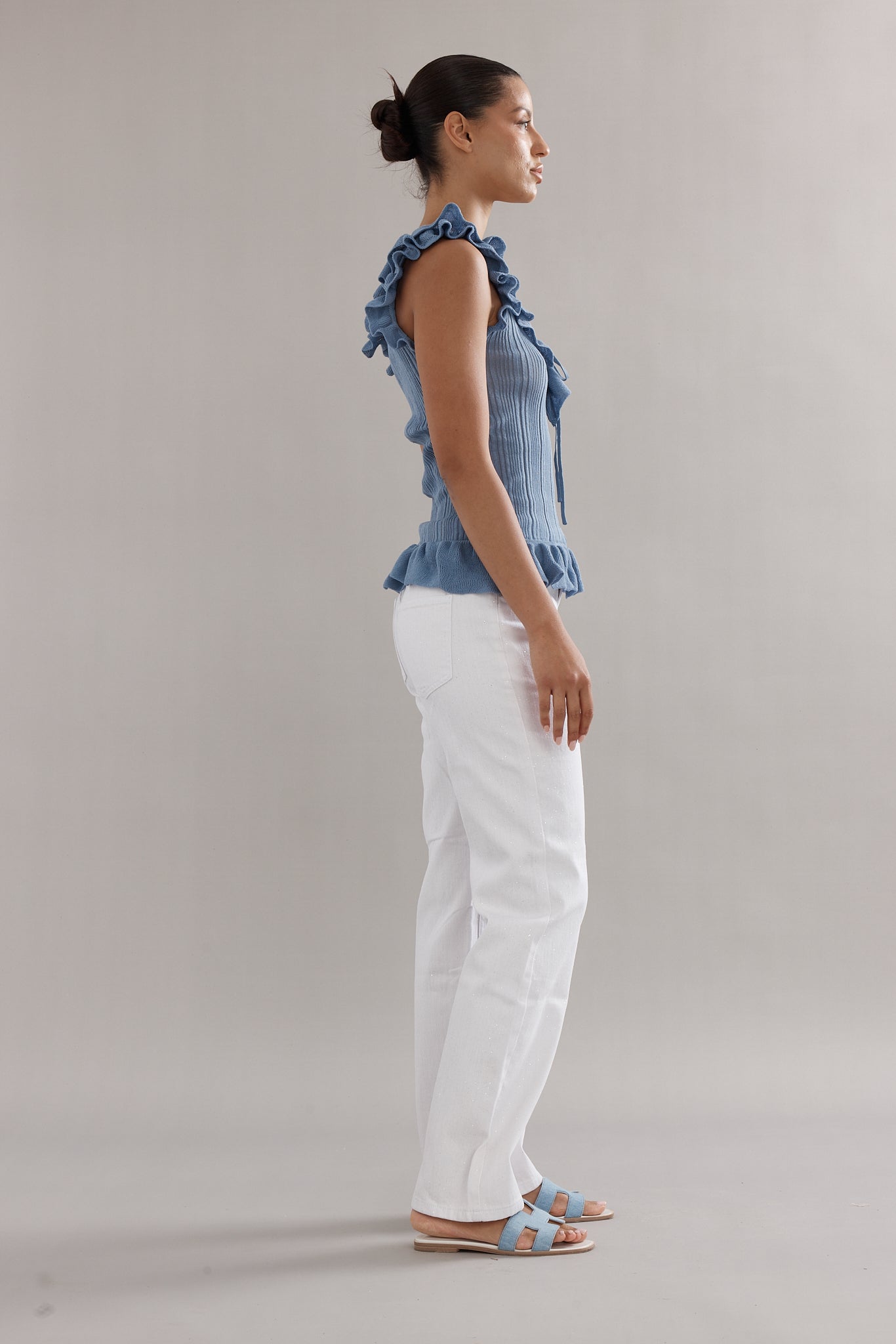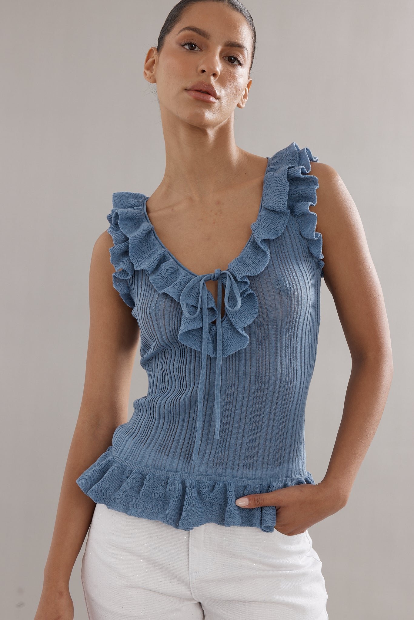 A knit tank, with a feminine twist. Designed in the same rib knit as The Angelica Dress, The Darwin Tank is finished with ruffled edges and a tie-front neckline. Available in blue, white, and black, she’s the versatile little number you’ll be reaching for again and again.