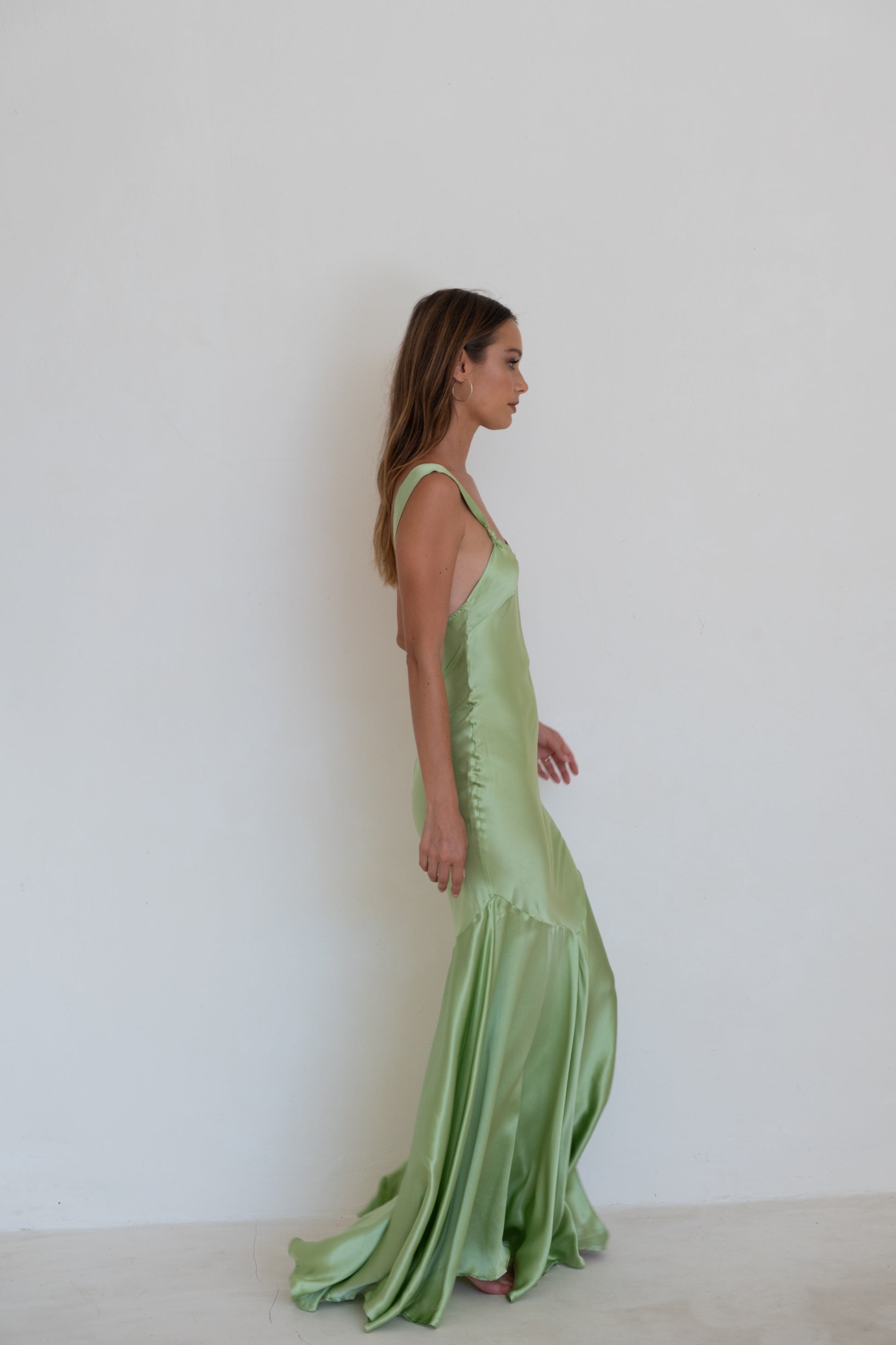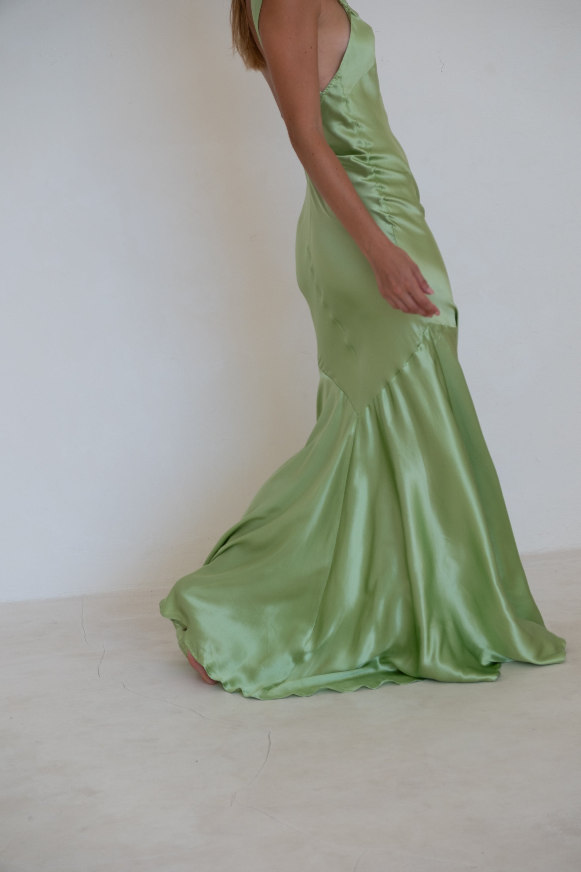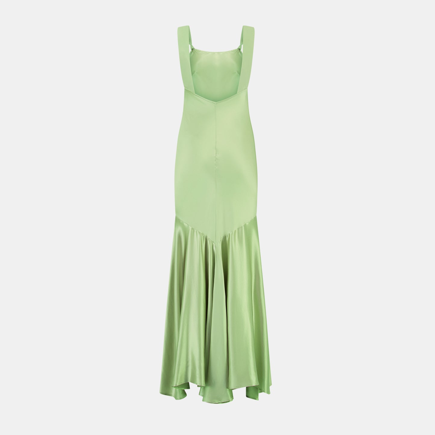You will fall in love with the Giselle dress with  its elegant silk touch and incredibly flattering silhouette that skims the body beautifully. Featuring a  fluted bias cut and knotted details.