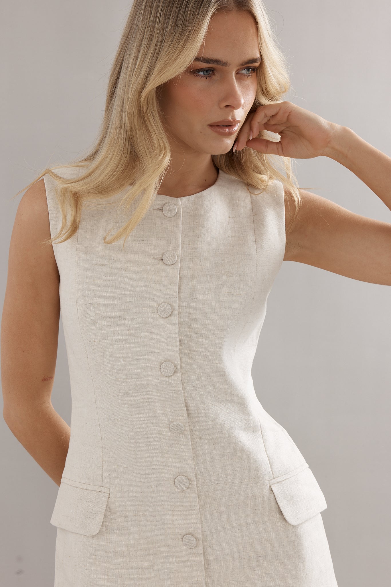 Introducing in the Manhattan Mini, a chic and playful dress crafted from Natural Linen. Featuring classic flap pockets and buttons down the front, this statement piece blends uptown polish with downtown edge. Perfect for brunch dates or city strolls—style it solo or layer it for year-round wear.
