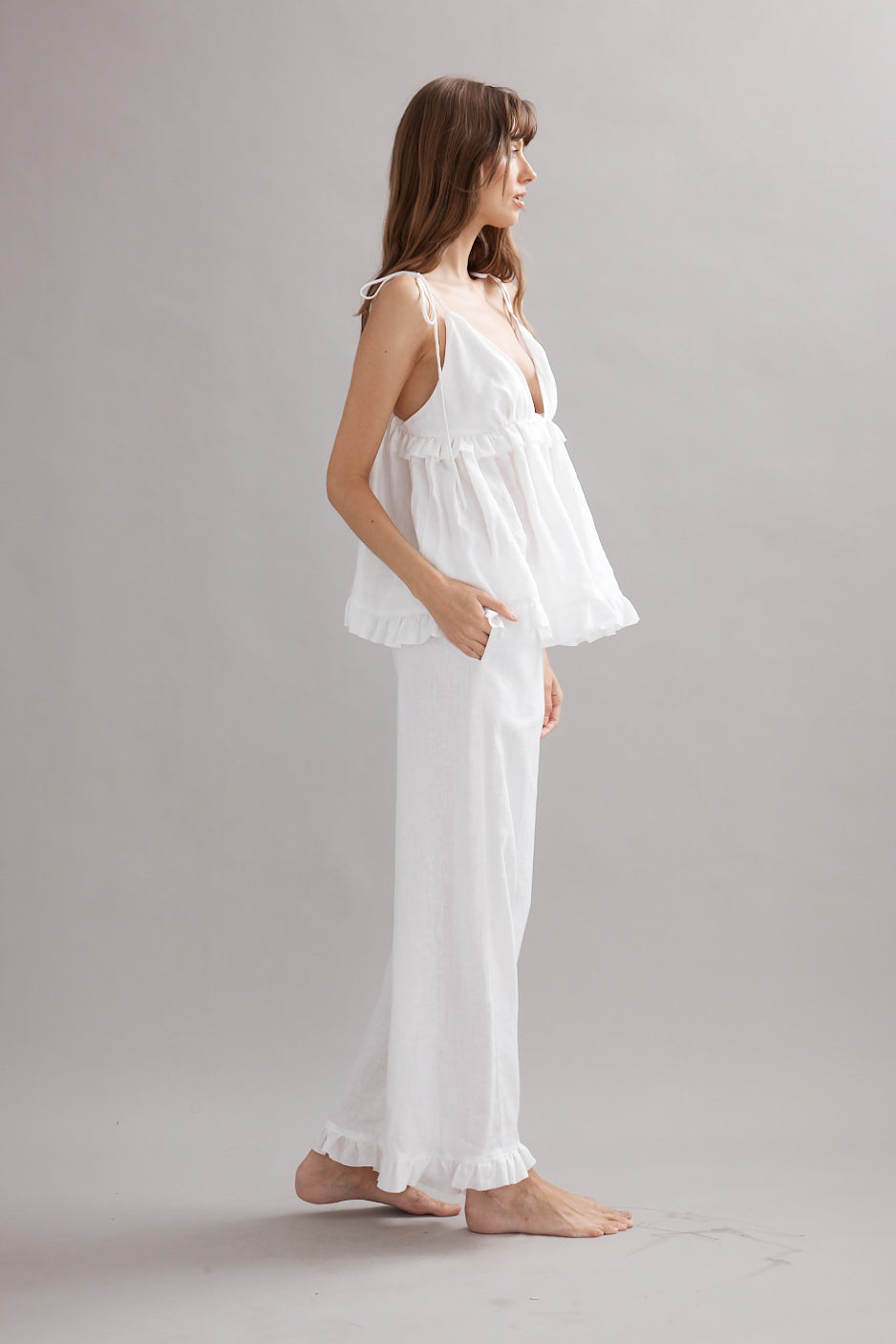 The Marilyn, crafted with an elasticated waistband, straight leg silhouette and a delicate frill hem. These pants pair perfectly with the Lily top or Monroe Robe. Designed to make you feel cute when lounging or the perfect getting ready set for you and your bridesmaids on your big day.