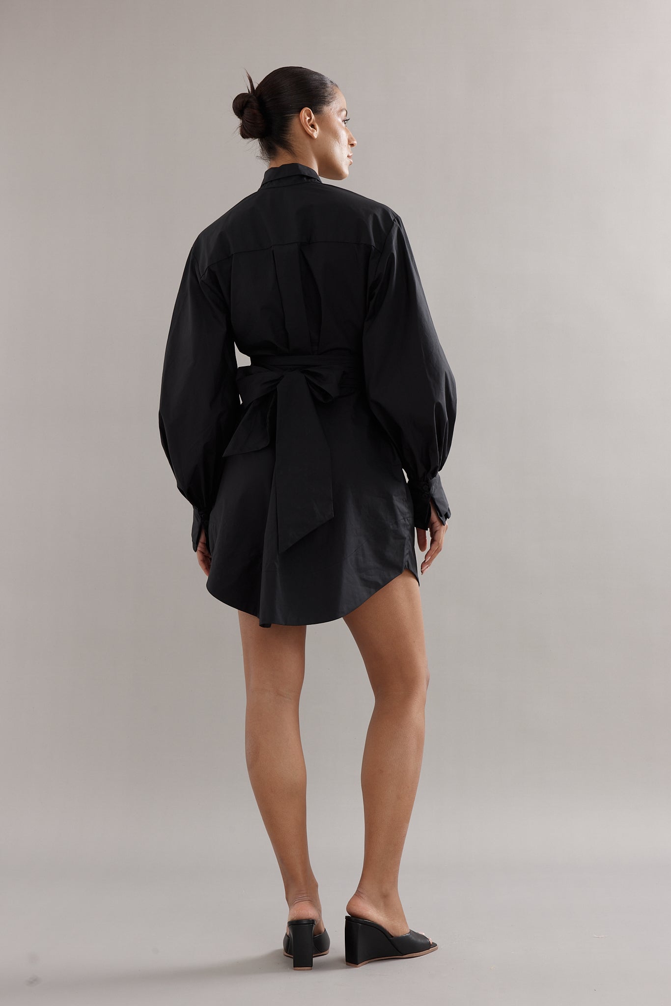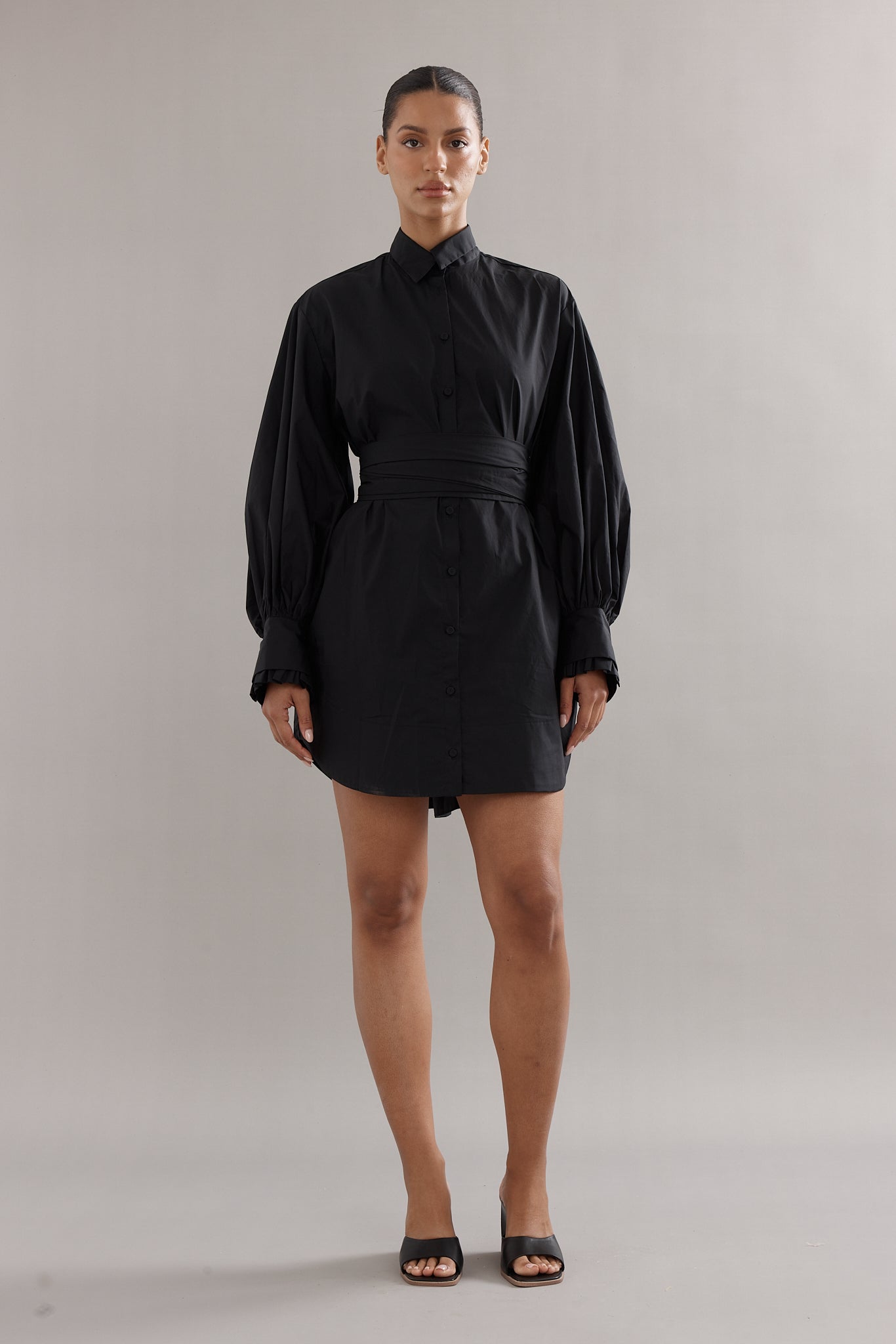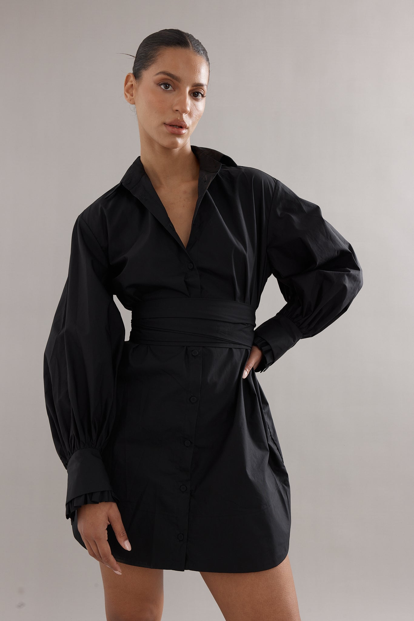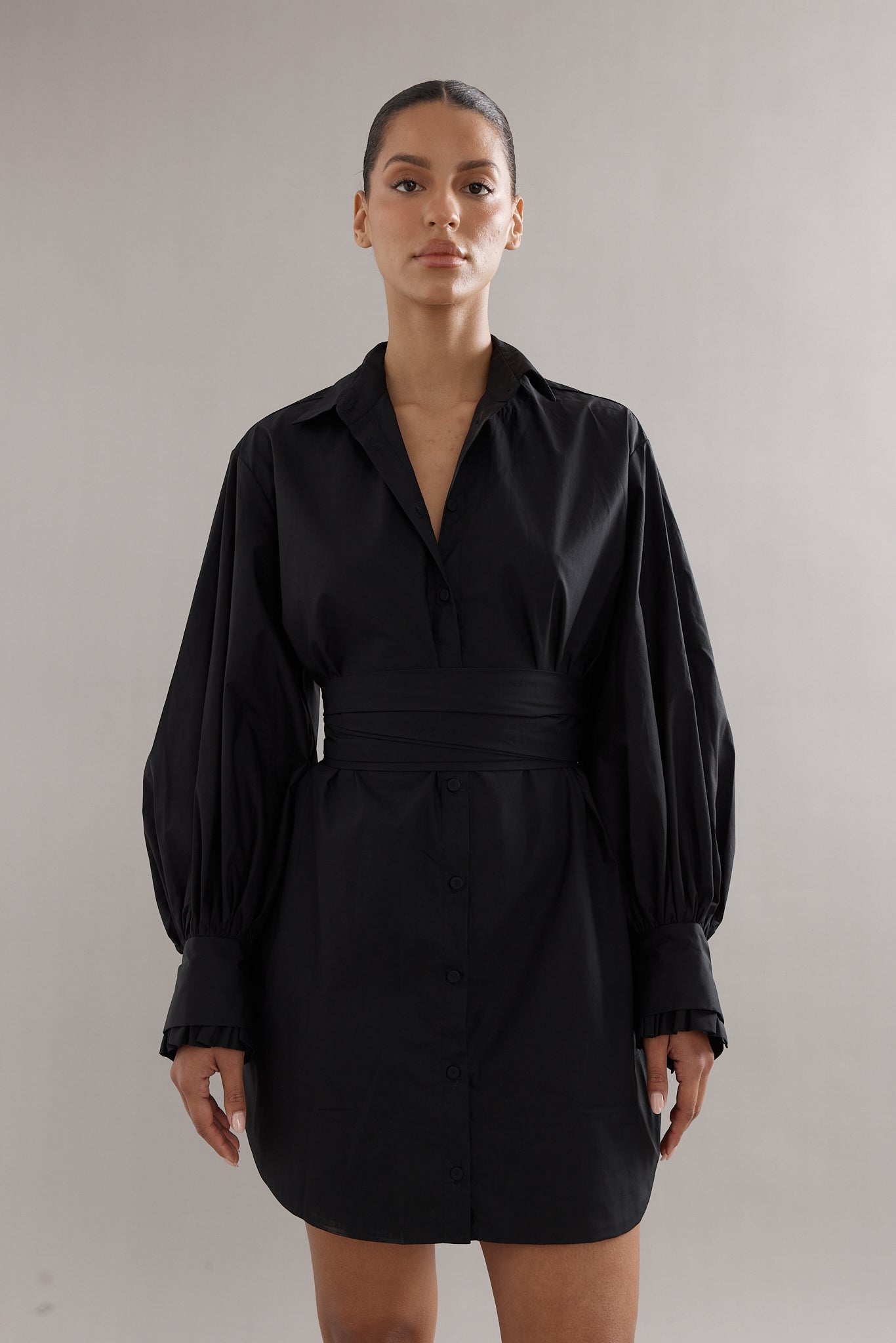 A fresh take on the classic shirt dress, the Mimi Mini in Black Poplin blends structure with soft tailoring. Featuring a crisp collar, long sleeves, and a smart silhouette, it’s designed with bow at the waist to cinch in or wear loose. An easy go-to for both casual and elevated looks.