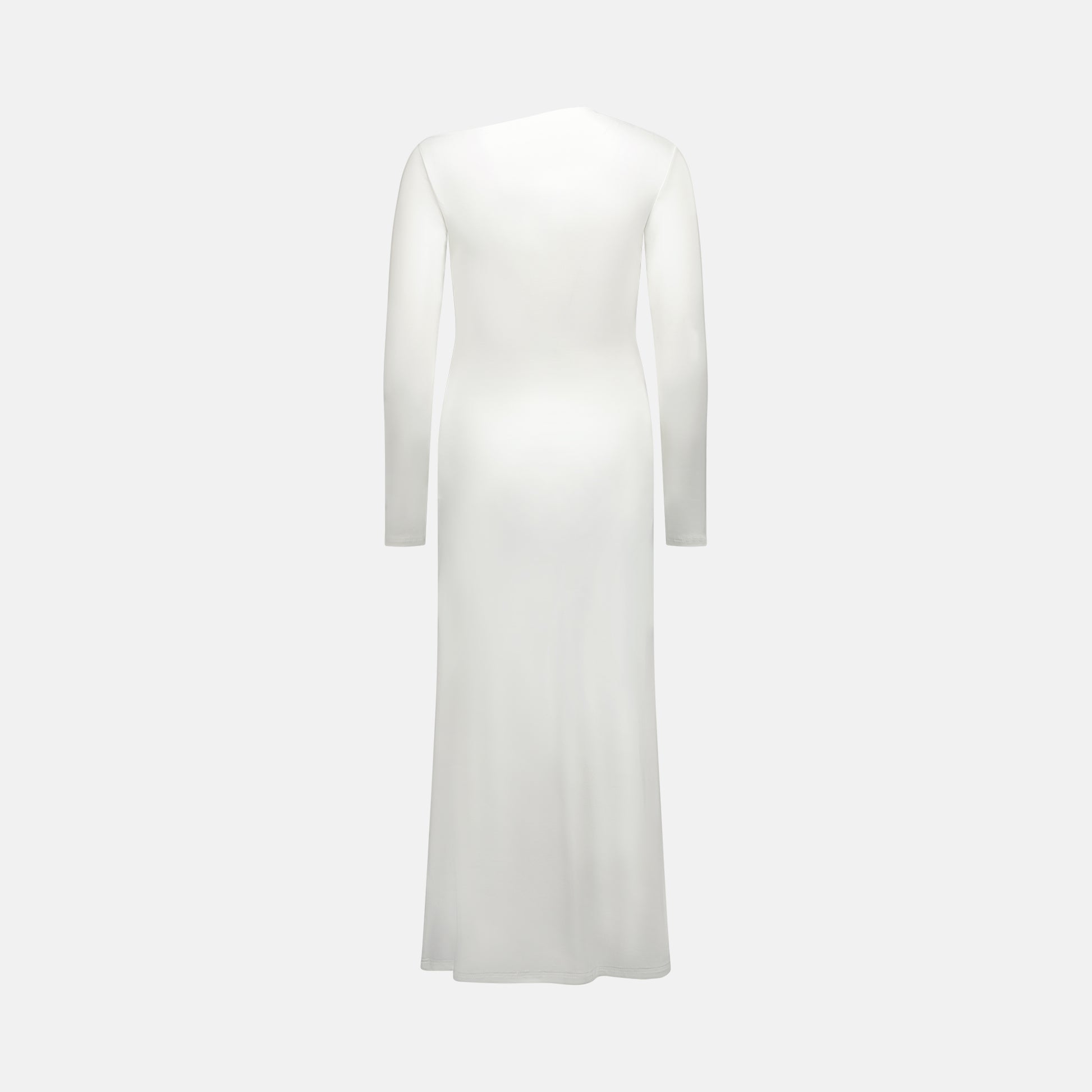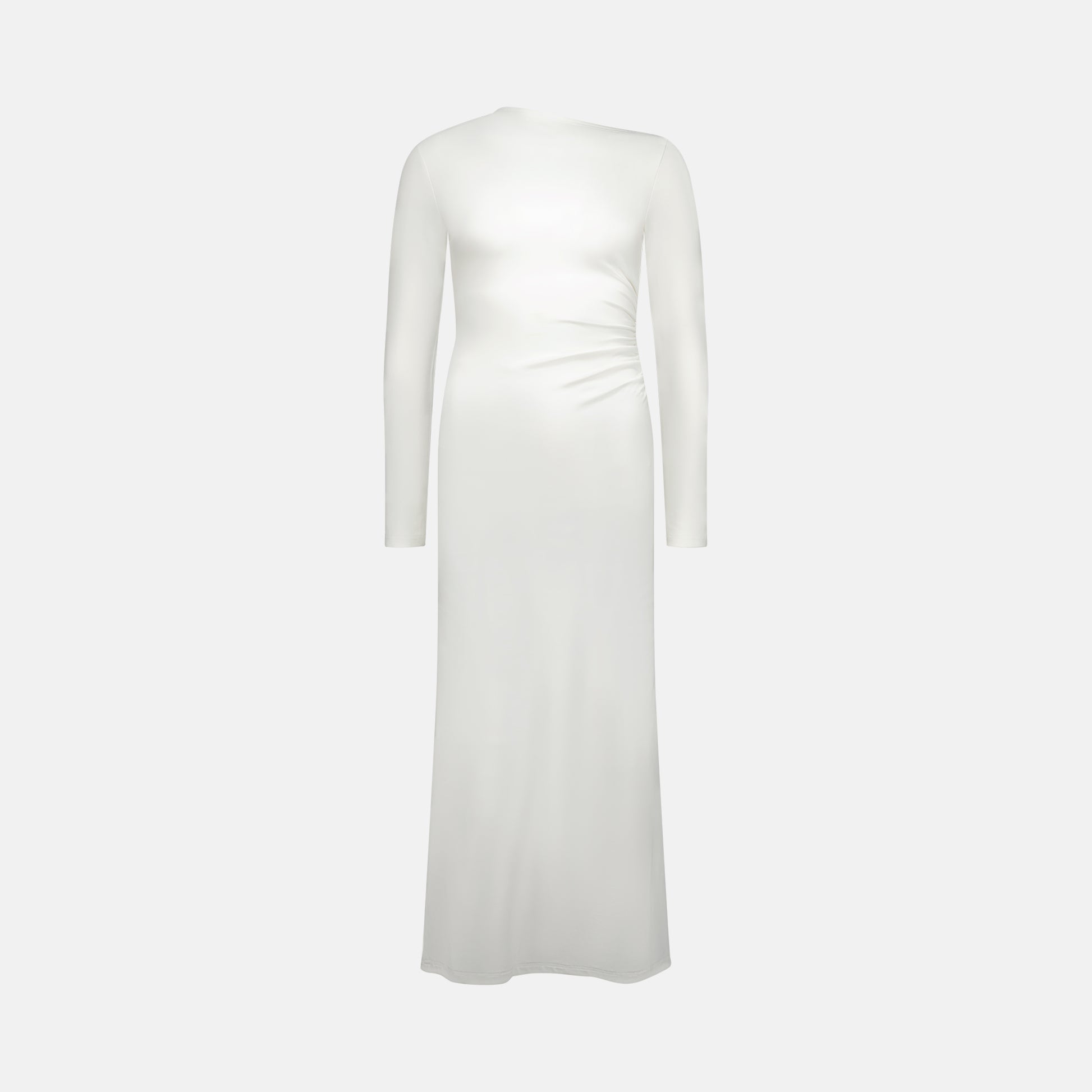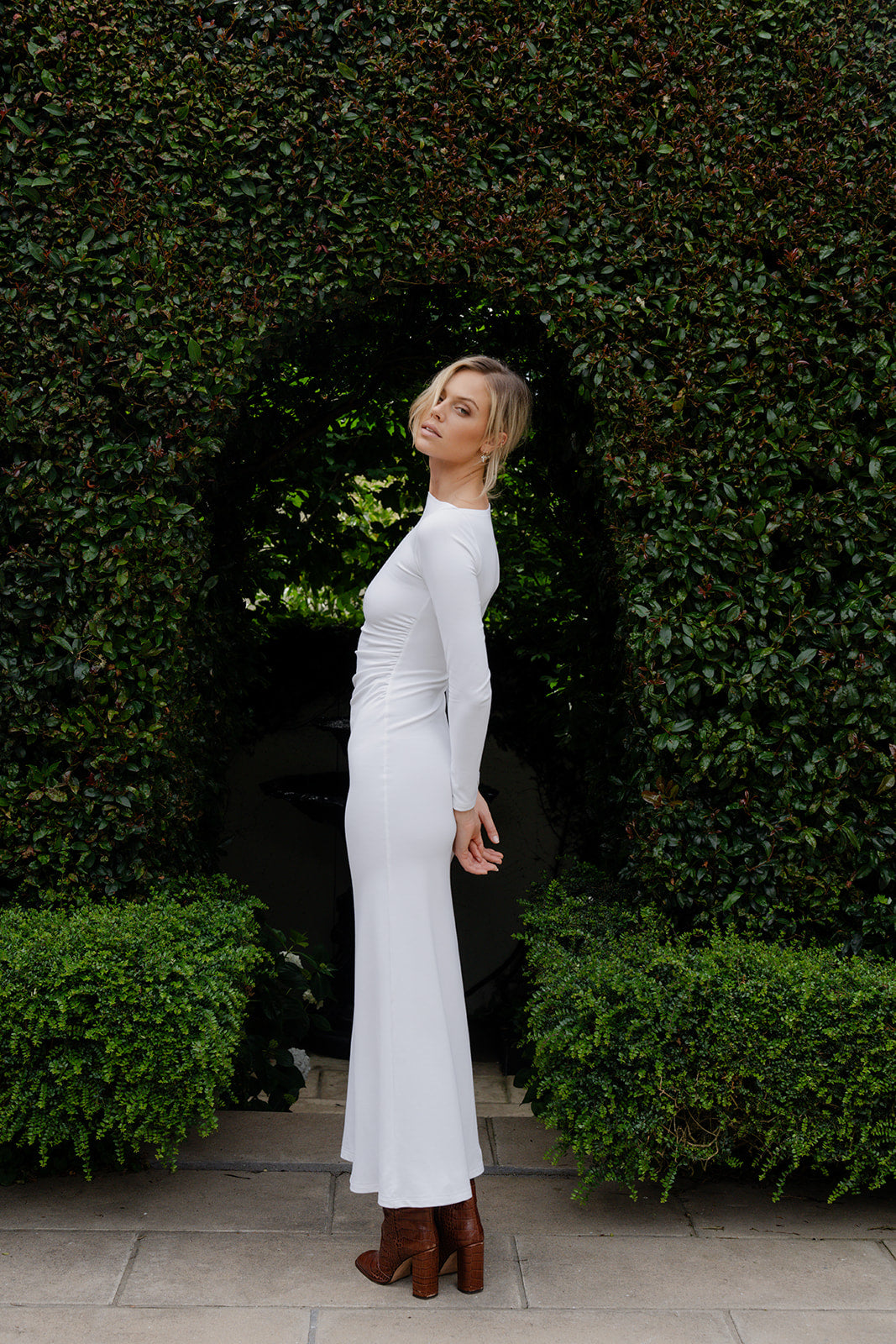 Your winter go-to dress. (Or for the winter bridal wardrobe!) Featuring an asymmetrical high neckline, subtle side ruching and a full length flattering fit. Made with a touch of stretch for comfort and wearability. Pair with sneakers and a trench for everyday, or a statement heel for the evening.