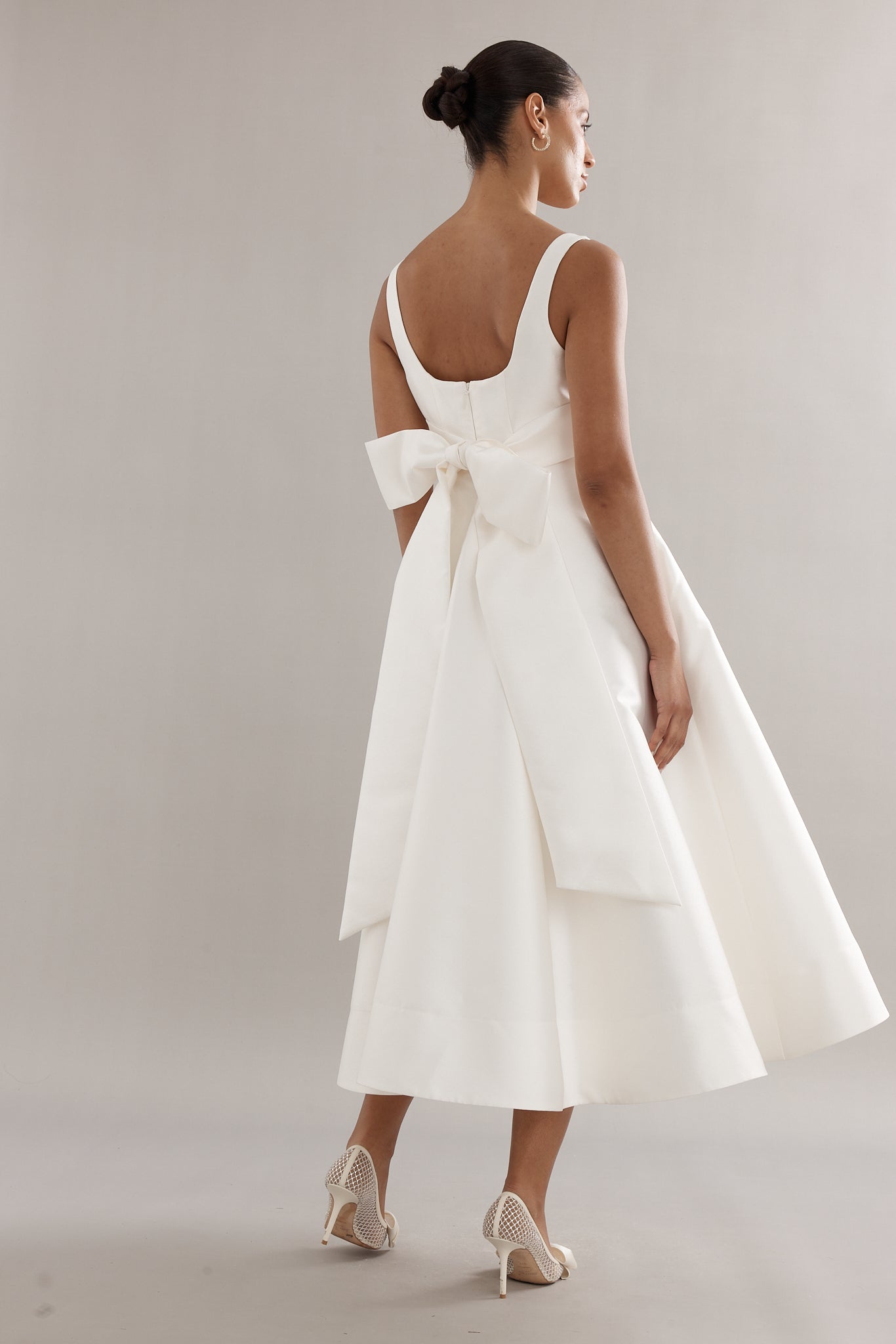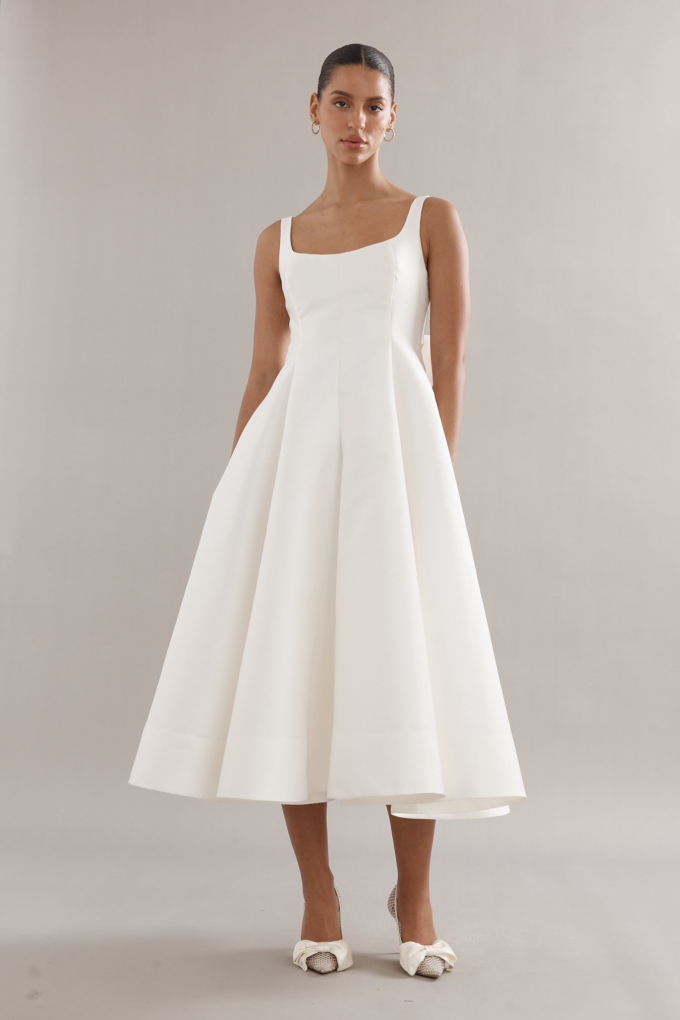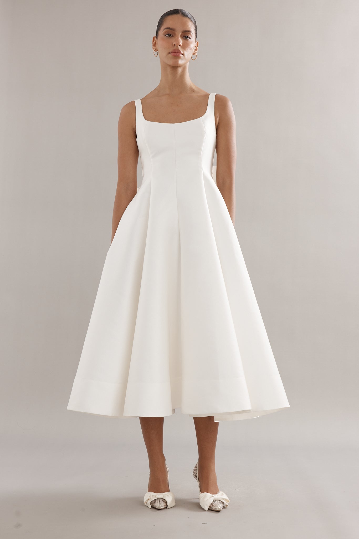 The Clementine is a structured mid-length gown that captures both sophistication and charm. With a flattering square neckline, wide straps, and a full A-line skirt, it offers a refined silhouette that feels both classic and contemporary.