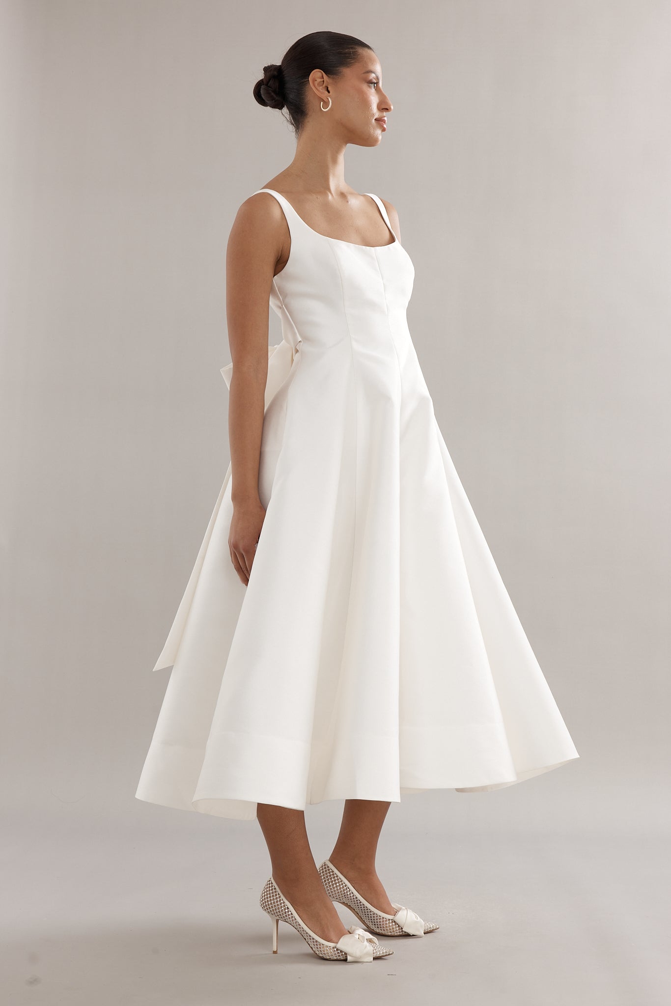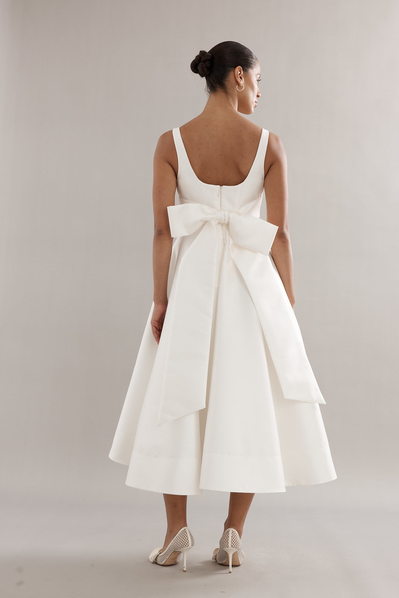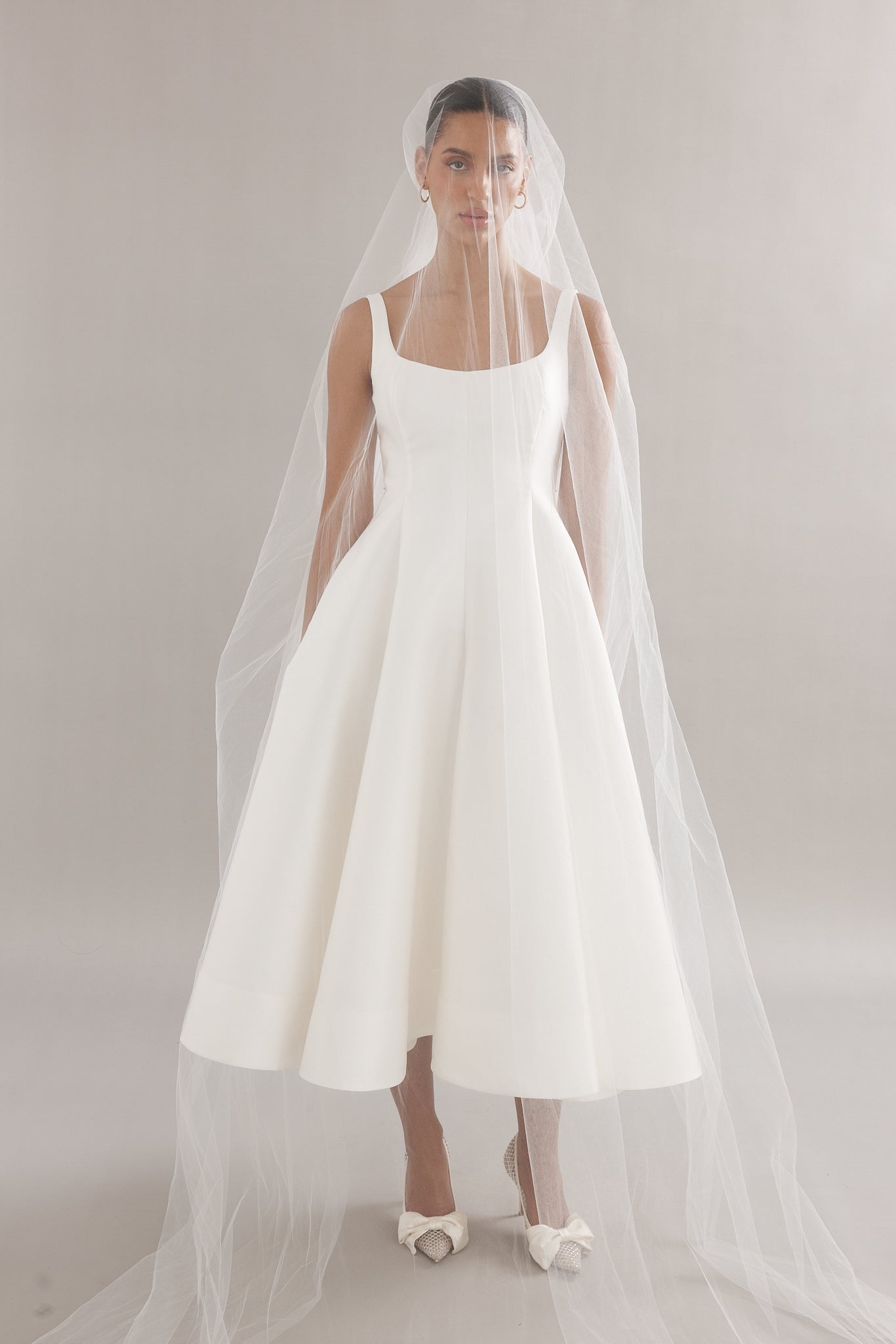 The Clementine is a structured mid-length gown that captures both sophistication and charm. With a flattering square neckline, wide straps, and a full A-line skirt, it offers a refined silhouette that feels both classic and contemporary.