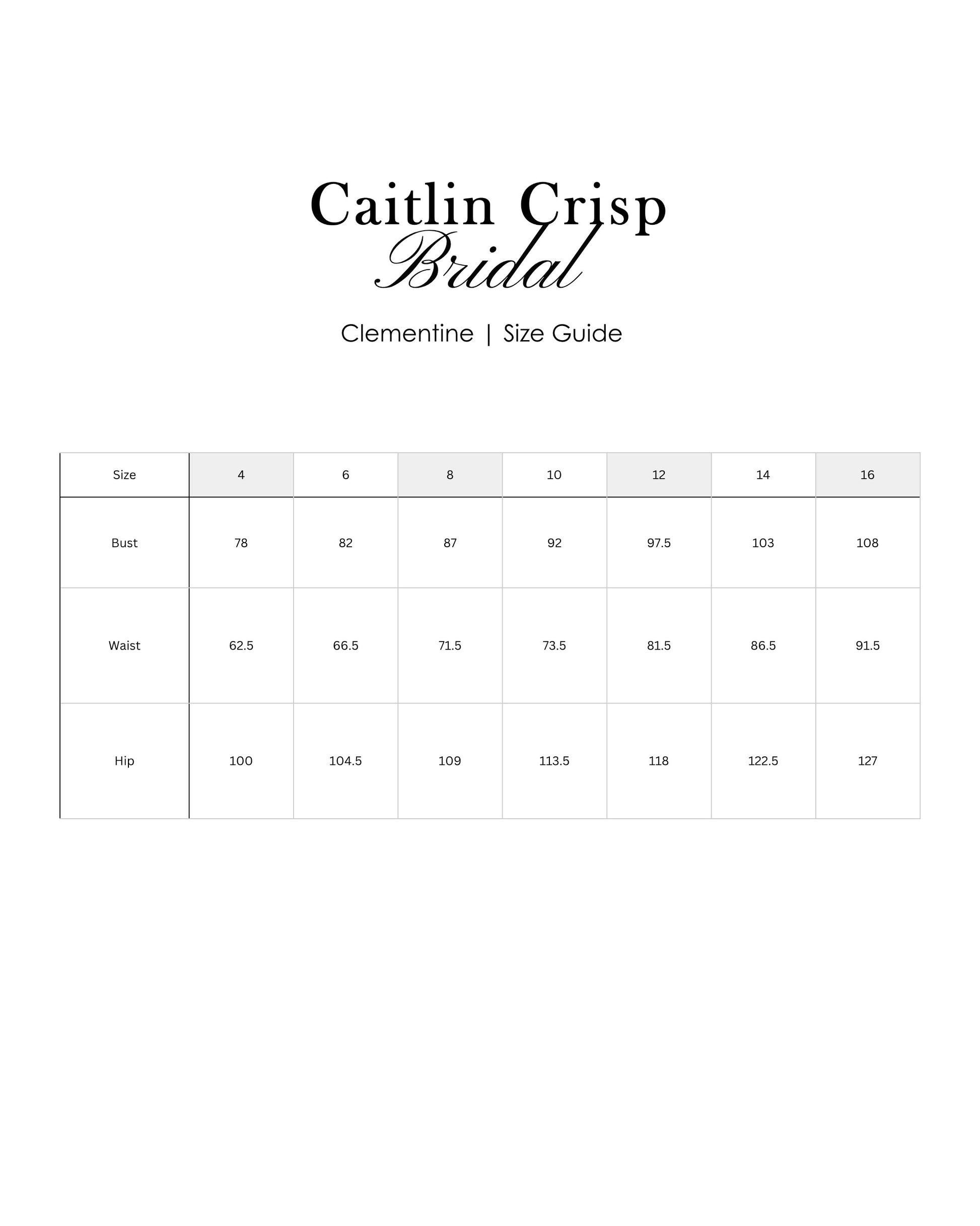 Refer to the garment specific size guide (in cms) attached in the photos on the product to find your perfect size, we have notes on how to take your measurements here. Please email info@caitlincrisp.com if you need any assistance with this - we're happy to help!