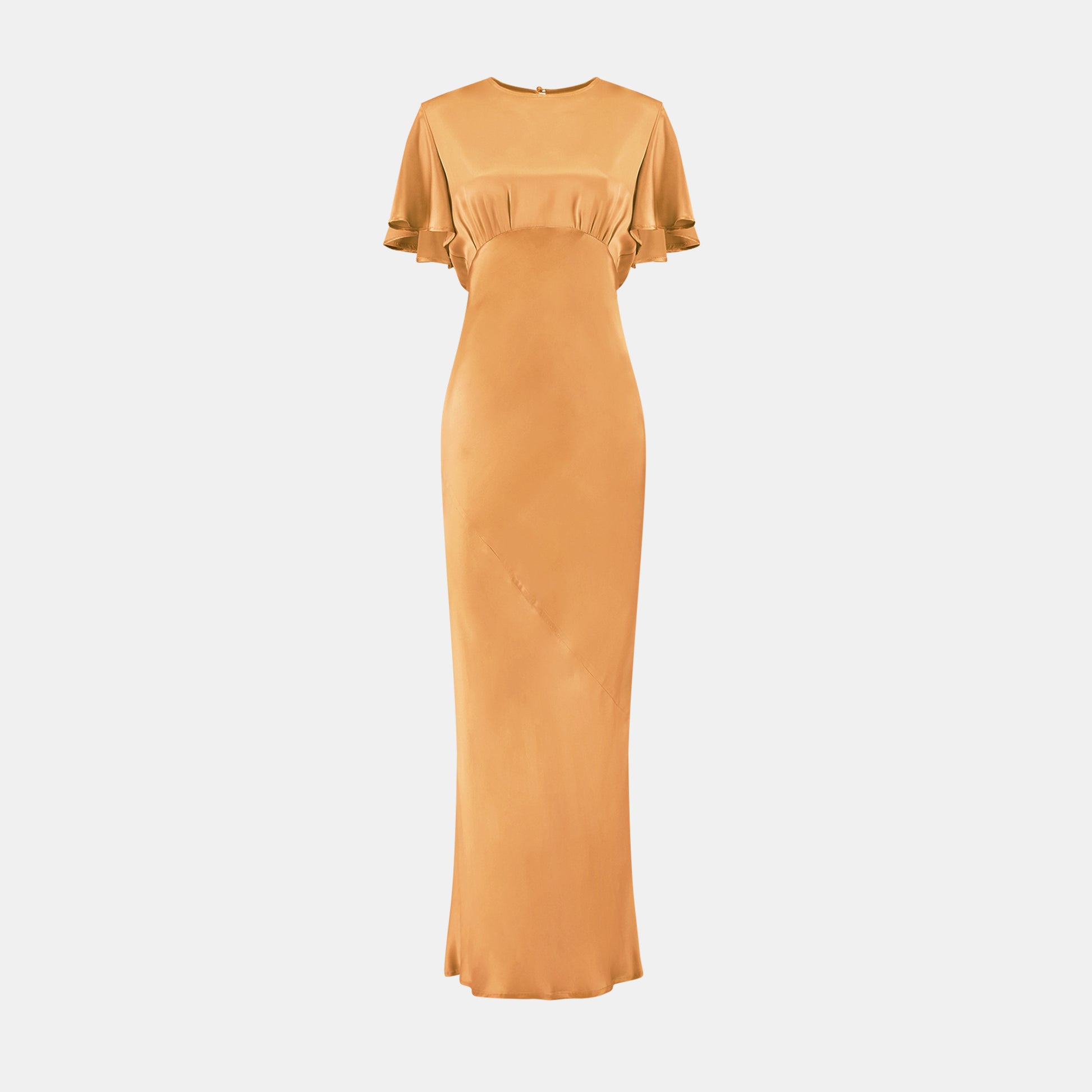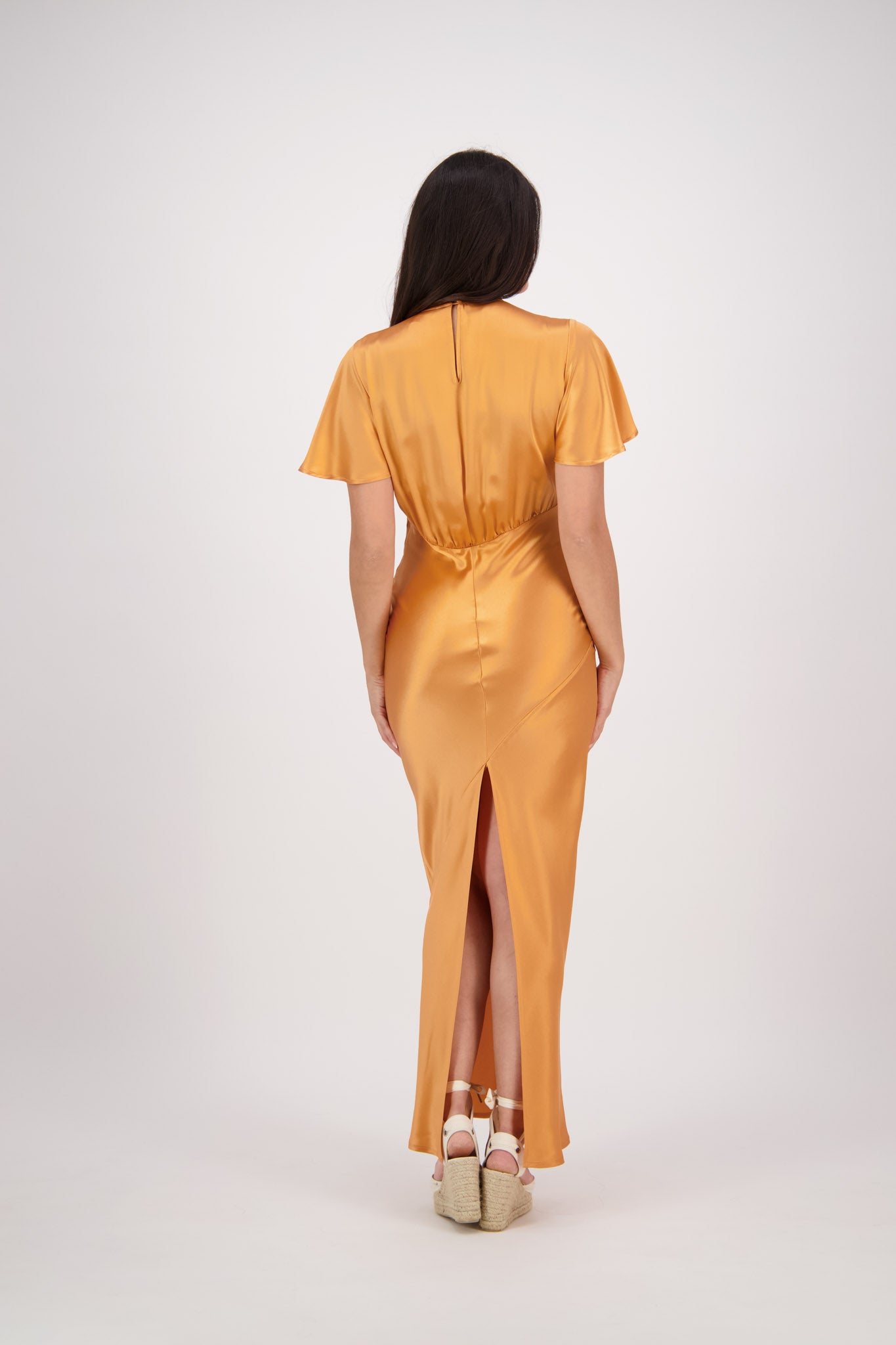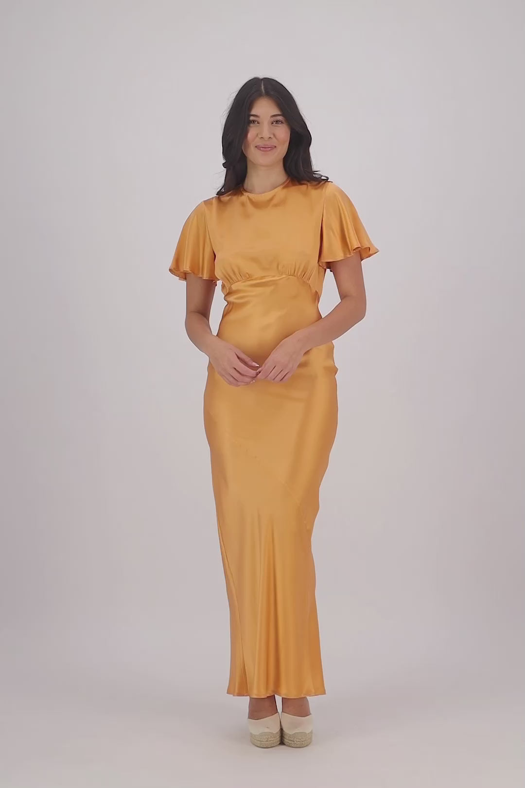 Featuring a shaped empire style on the bust and fully cut on the bias for an elegant and flattering fit. Fluted sleeves and keyhole with a button closure at the back.