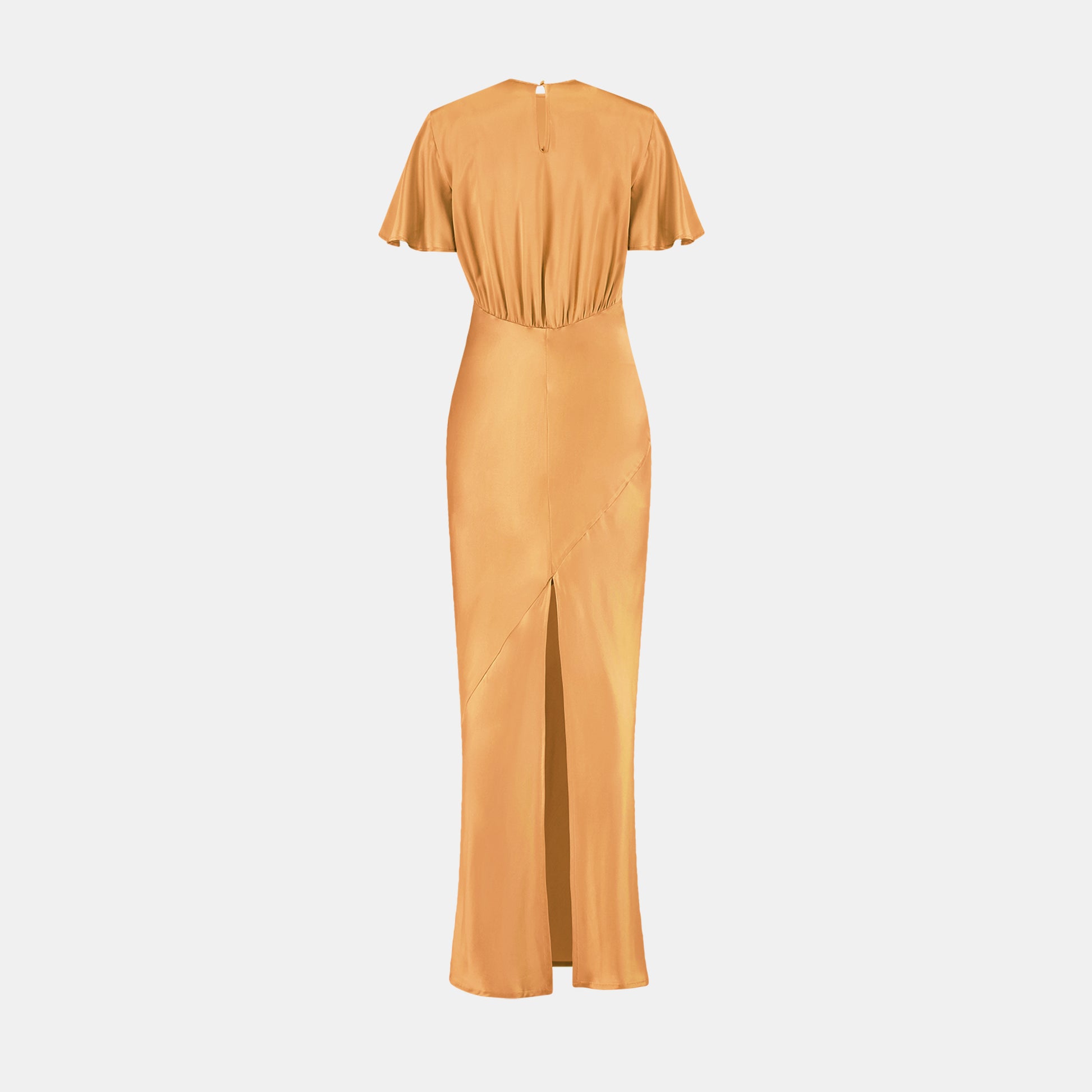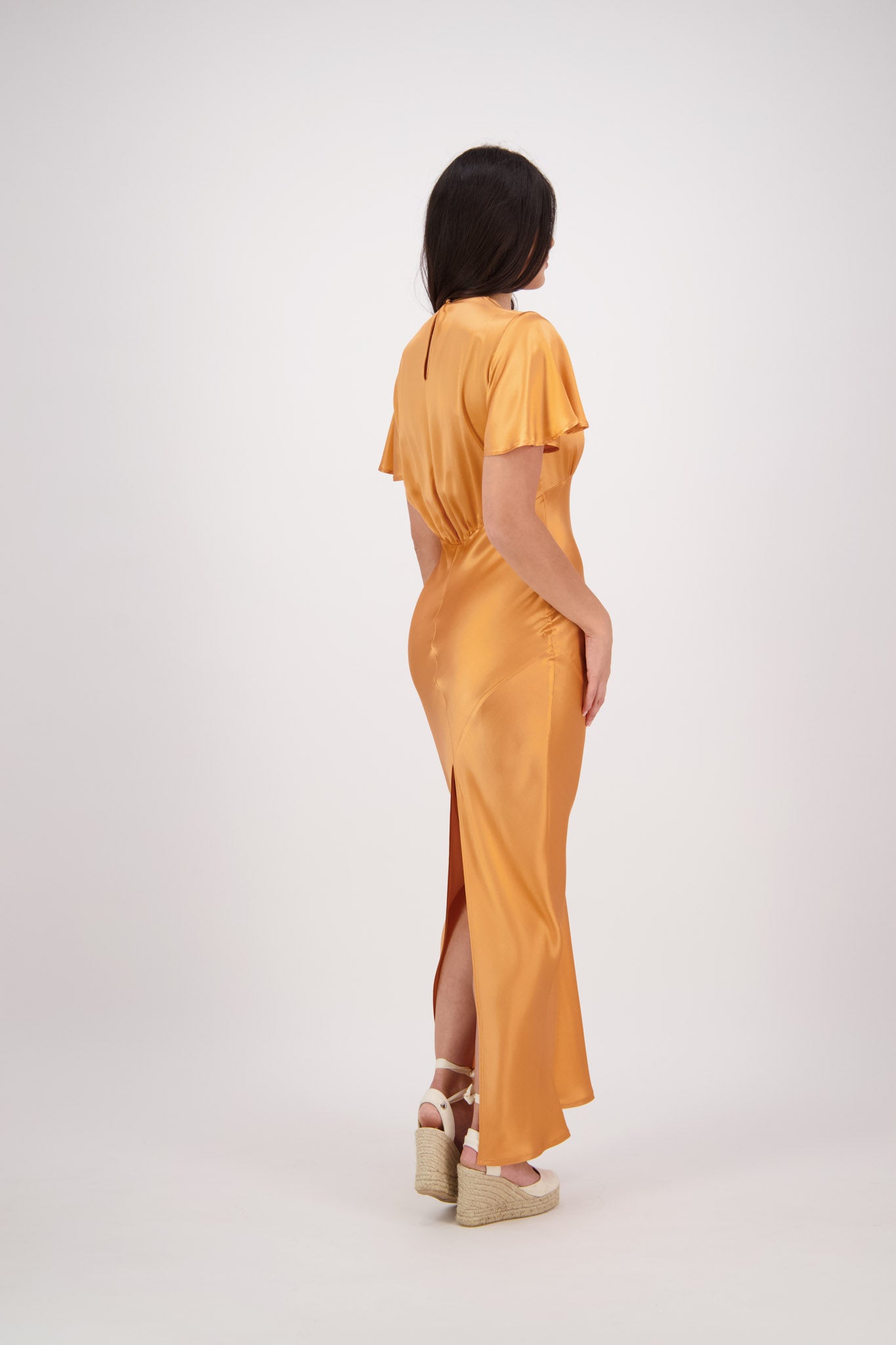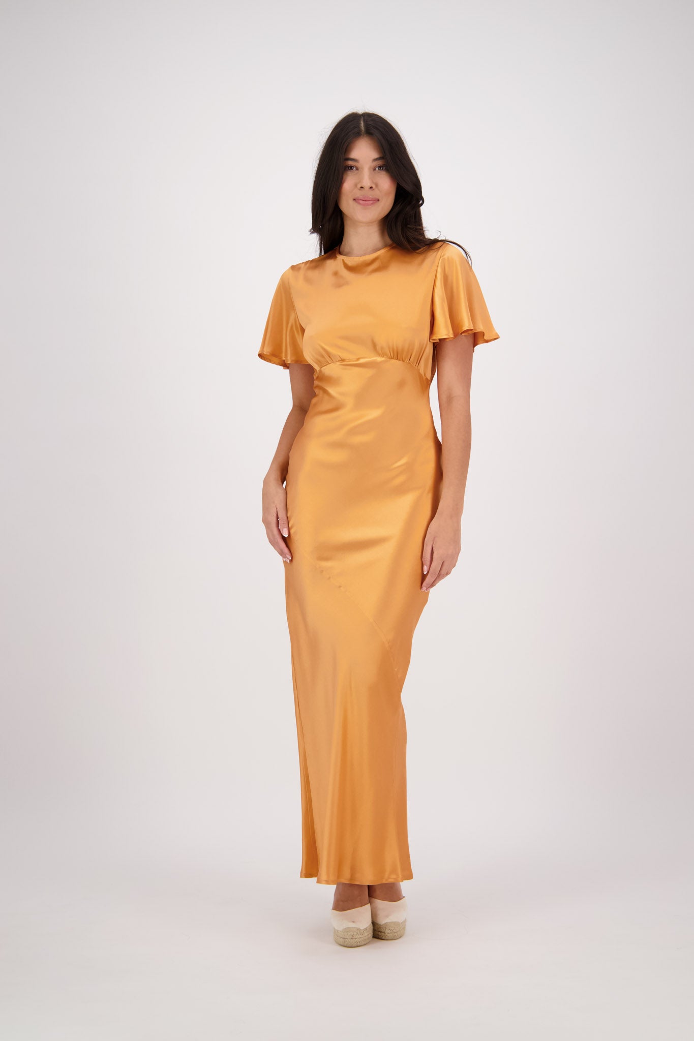Featuring a shaped empire style on the bust and fully cut on the bias for an elegant and flattering fit. Fluted sleeves and keyhole with a button closure at the back.