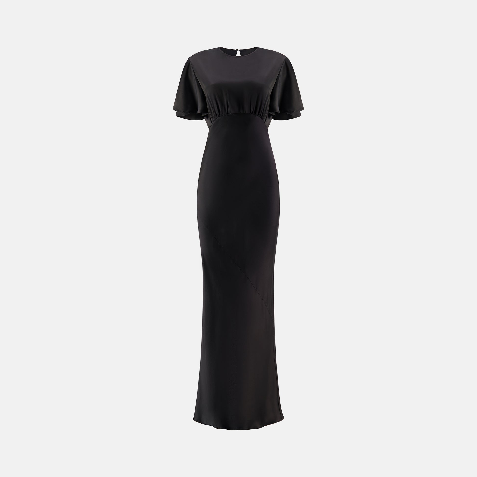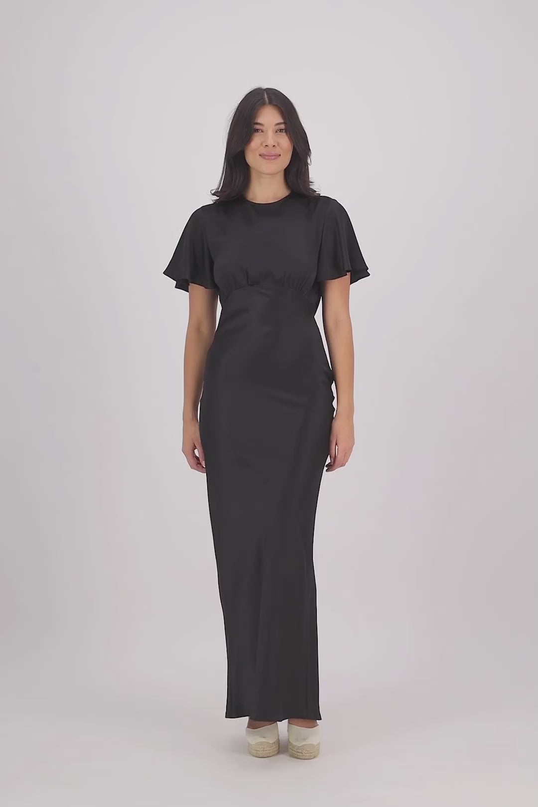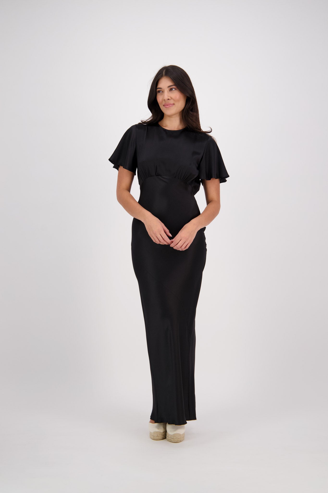Featuring a shaped empire style on the bust and fully cut on the bias for an elegant and flattering fit. Fluted sleeves and keyhole with a button closure at the back.