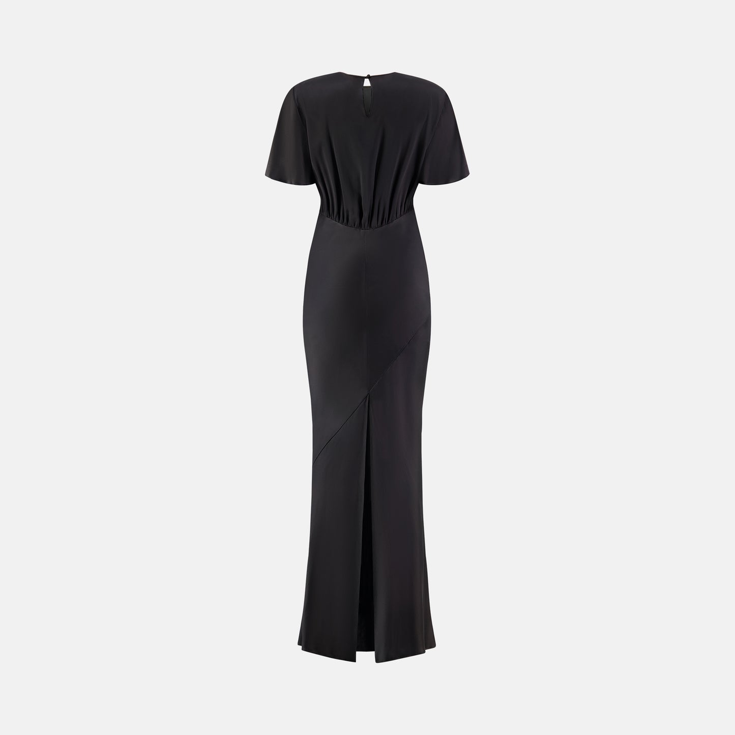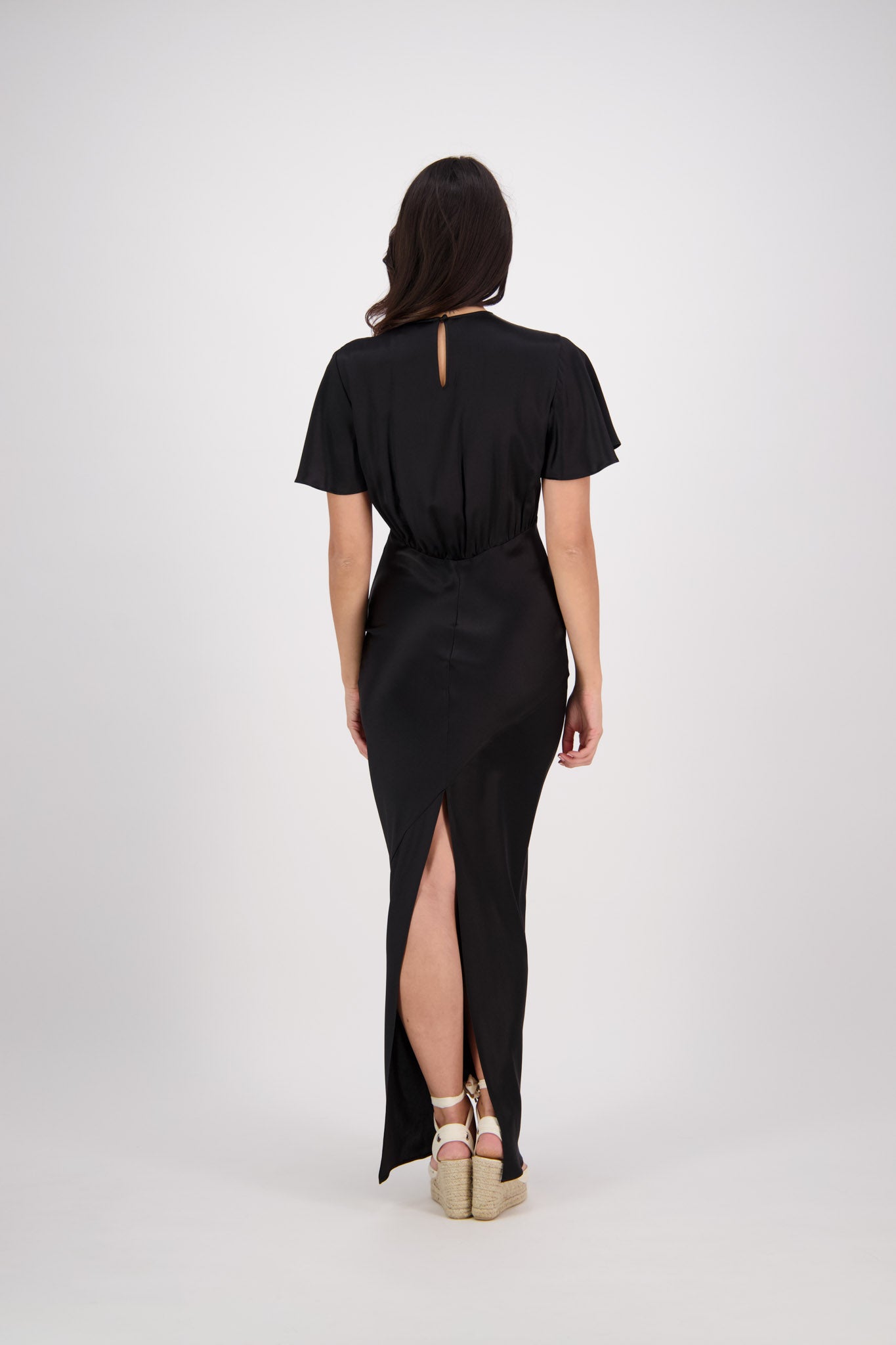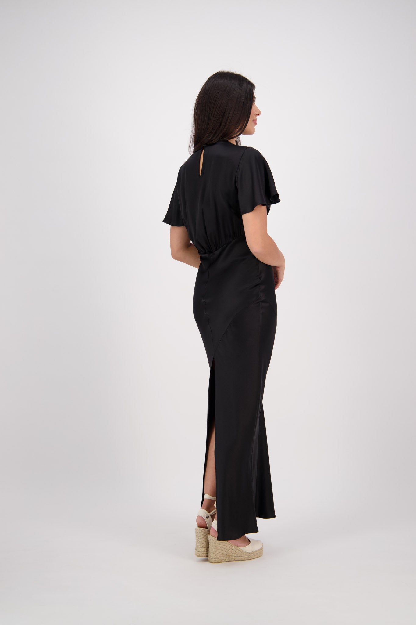 Featuring a shaped empire style on the bust and fully cut on the bias for an elegant and flattering fit. Fluted sleeves and keyhole with a button closure at the back.