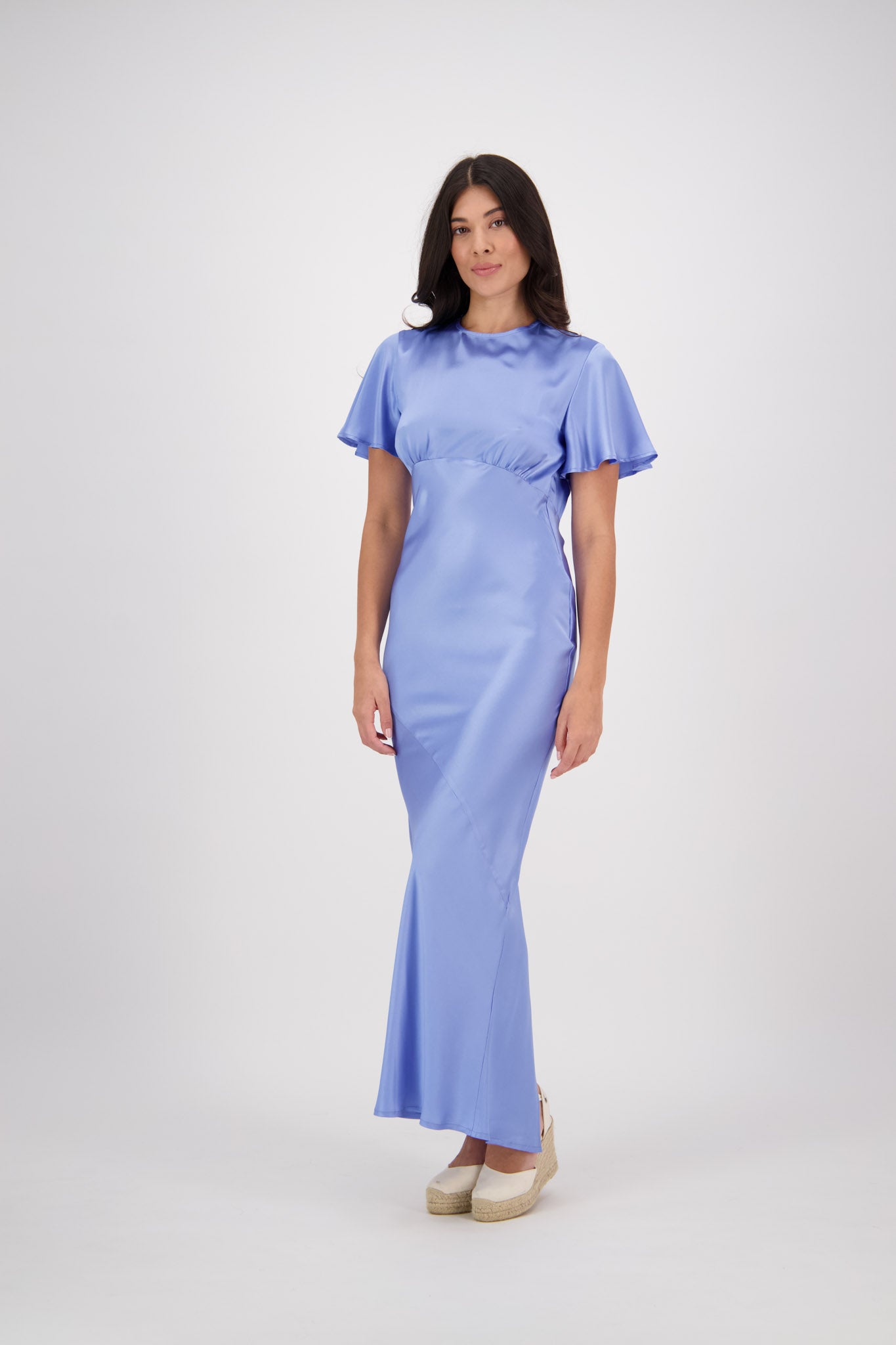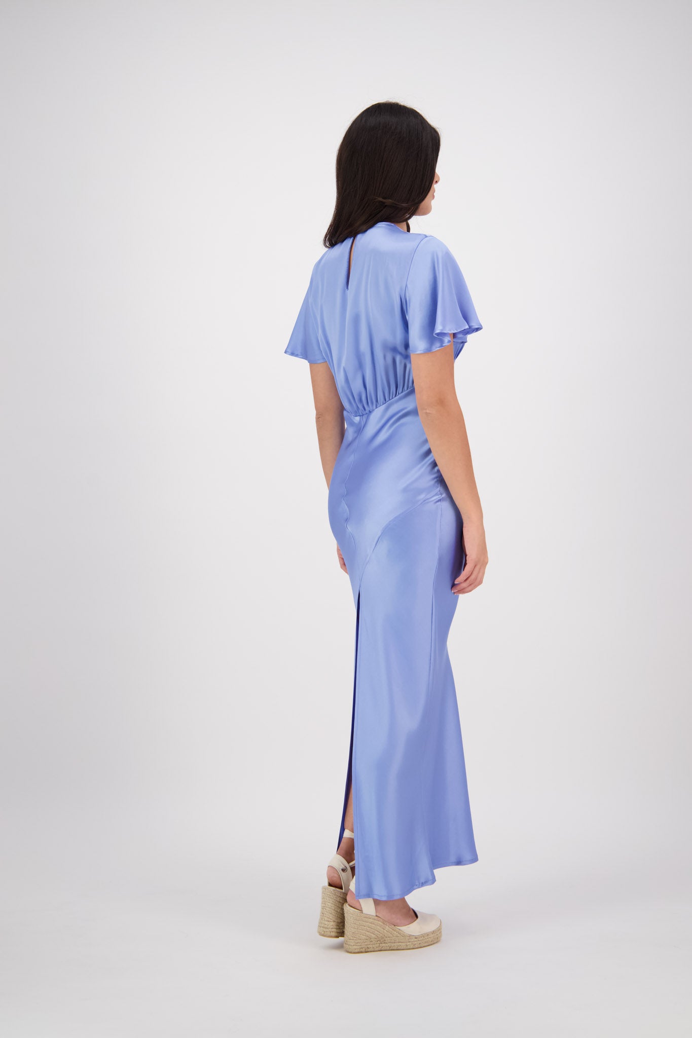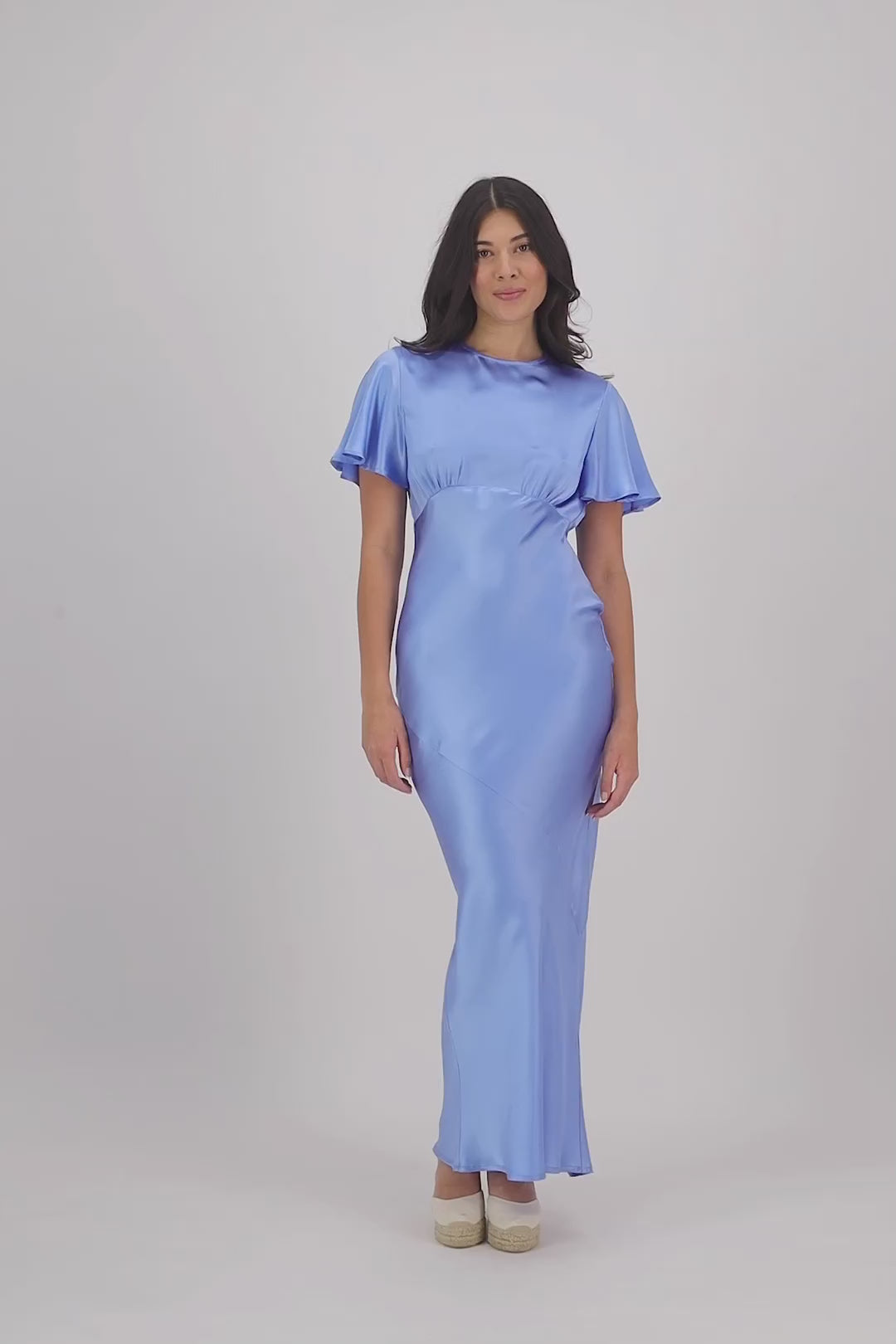 Featuring a shaped empire style on the bust and fully cut on the bias for an elegant and flattering fit. Fluted sleeves and keyhole with a button closure at the back.