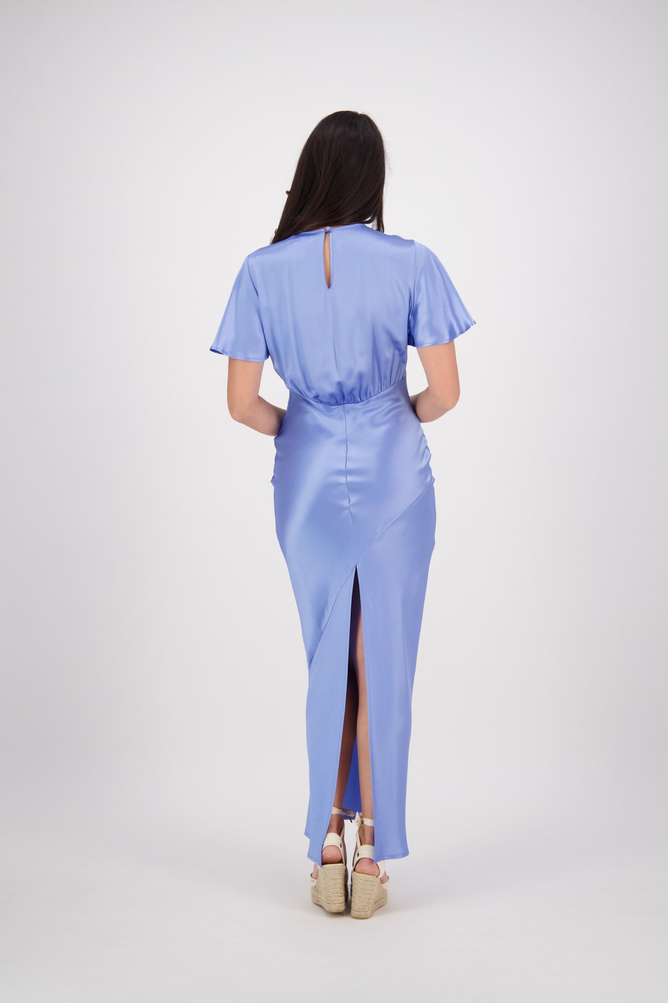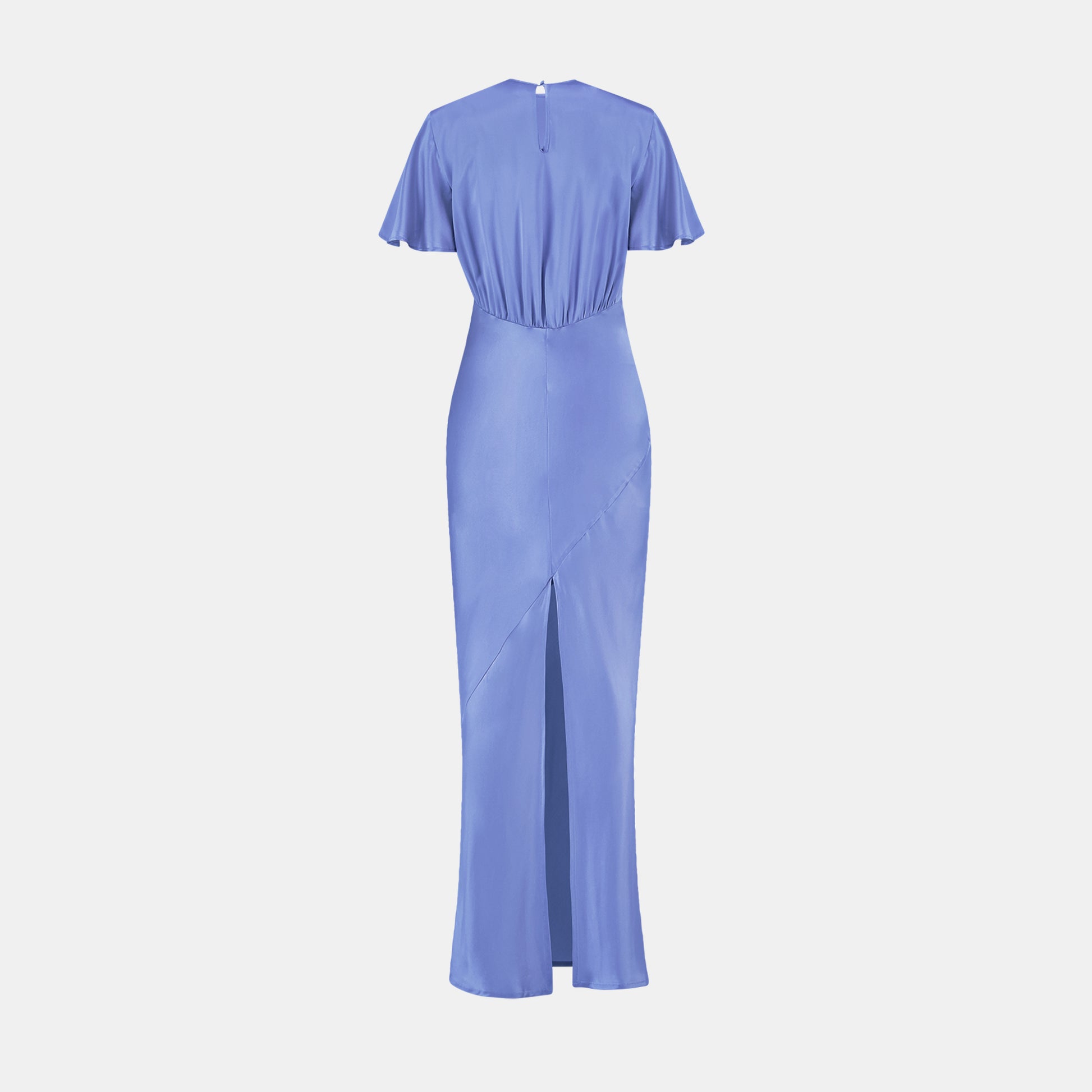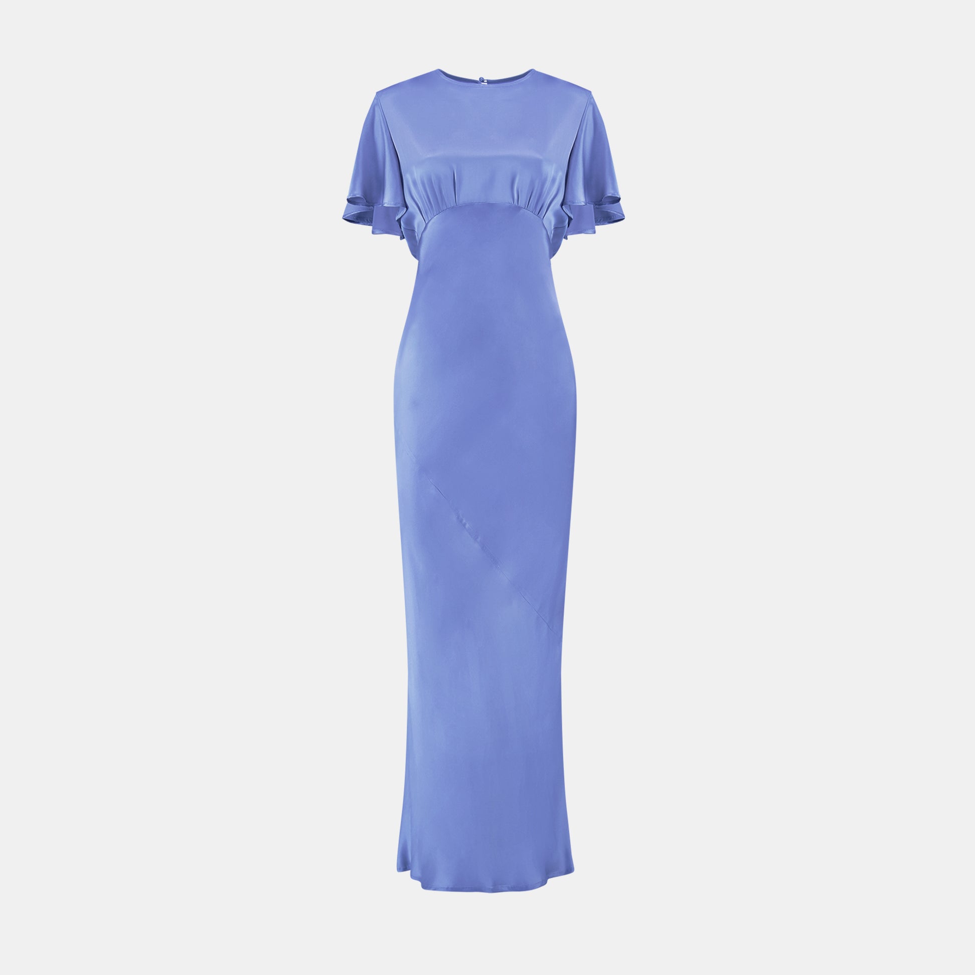 Featuring a shaped empire style on the bust and fully cut on the bias for an elegant and flattering fit. Fluted sleeves and keyhole with a button closure at the back.