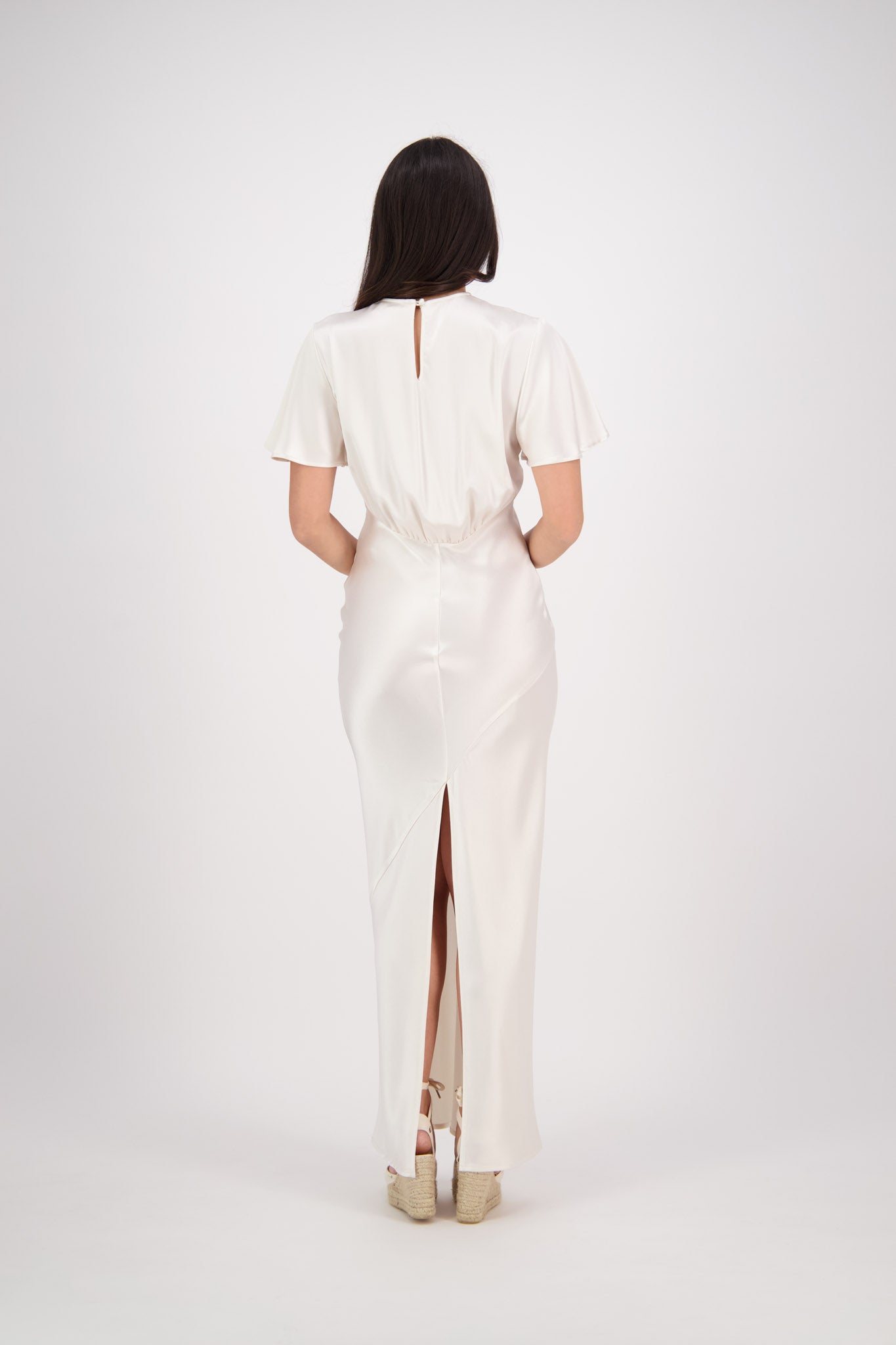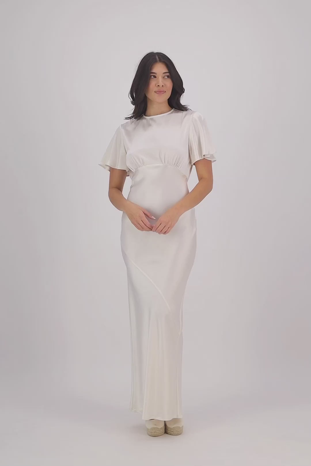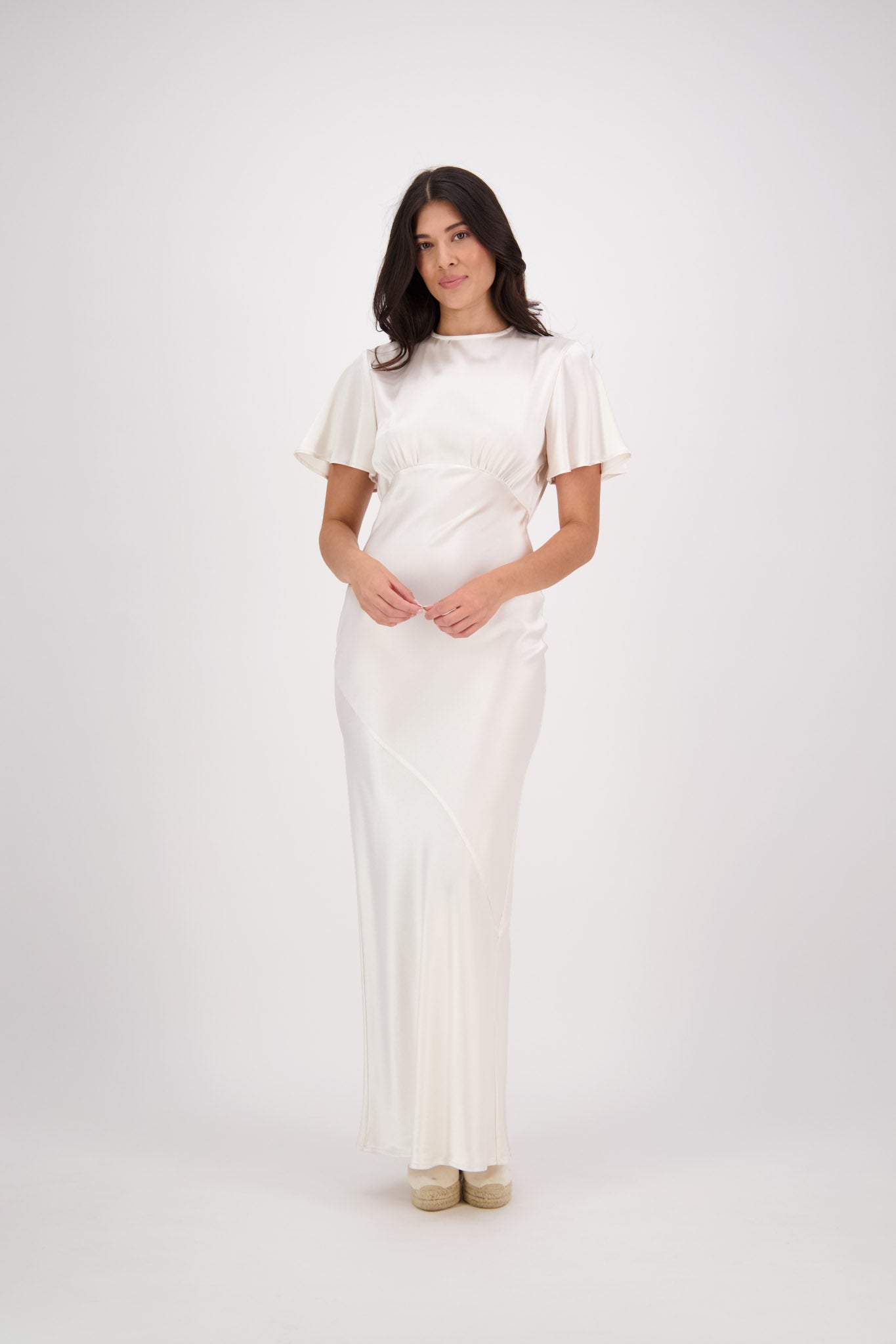 Featuring a shaped empire style on the bust and fully cut on the bias for an elegant and flattering fit. Fluted sleeves and keyhole with a button closure at the back.