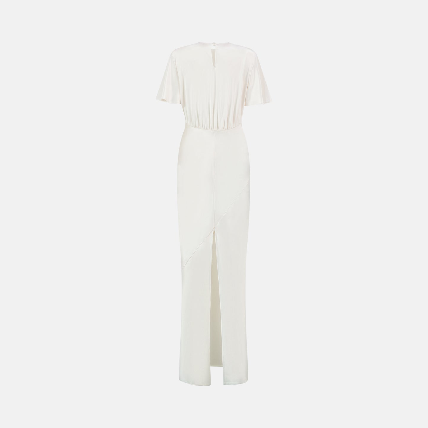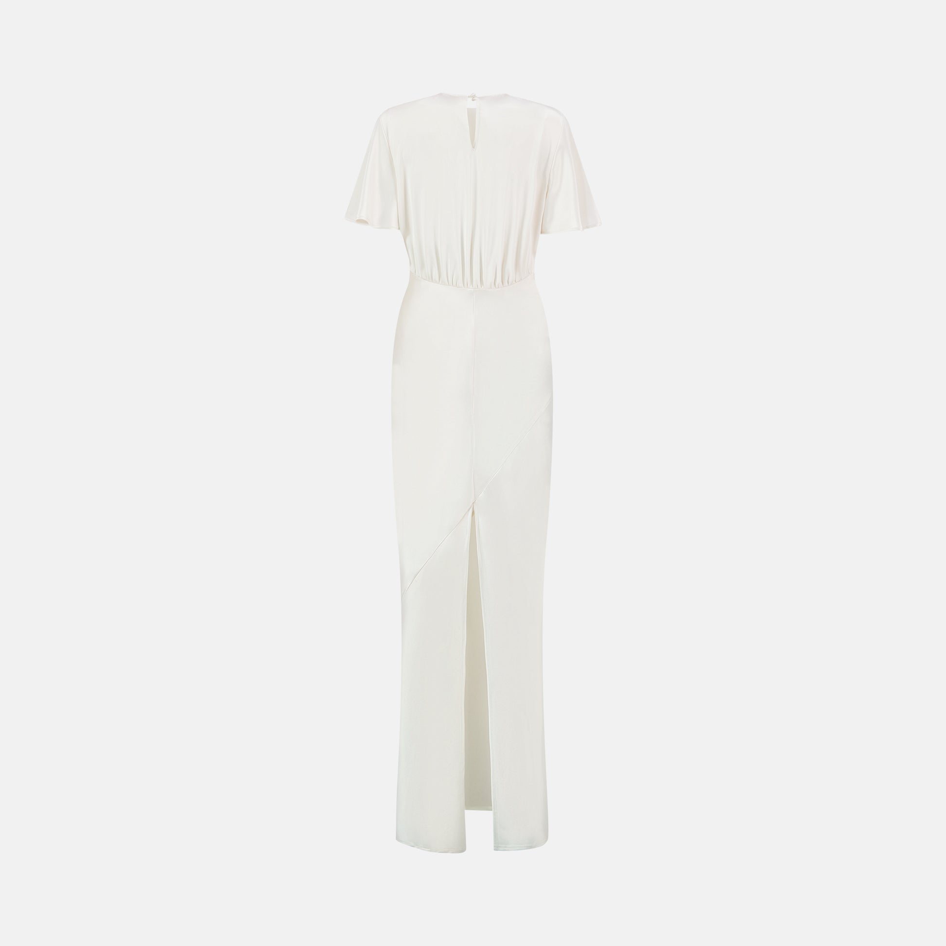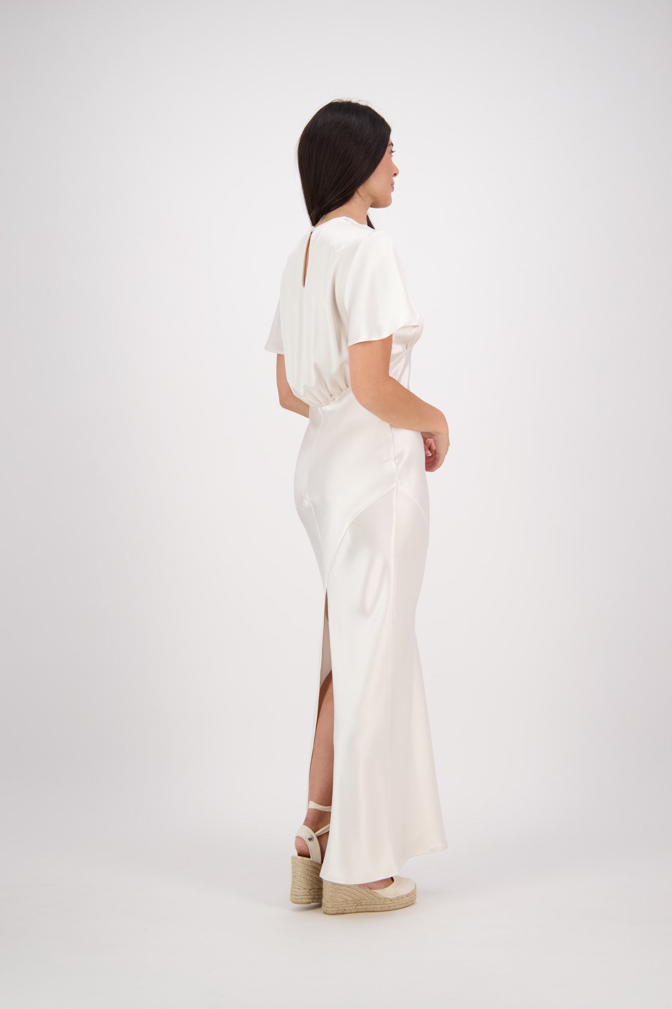 Featuring a shaped empire style on the bust and fully cut on the bias for an elegant and flattering fit. Fluted sleeves and keyhole with a button closure at the back.